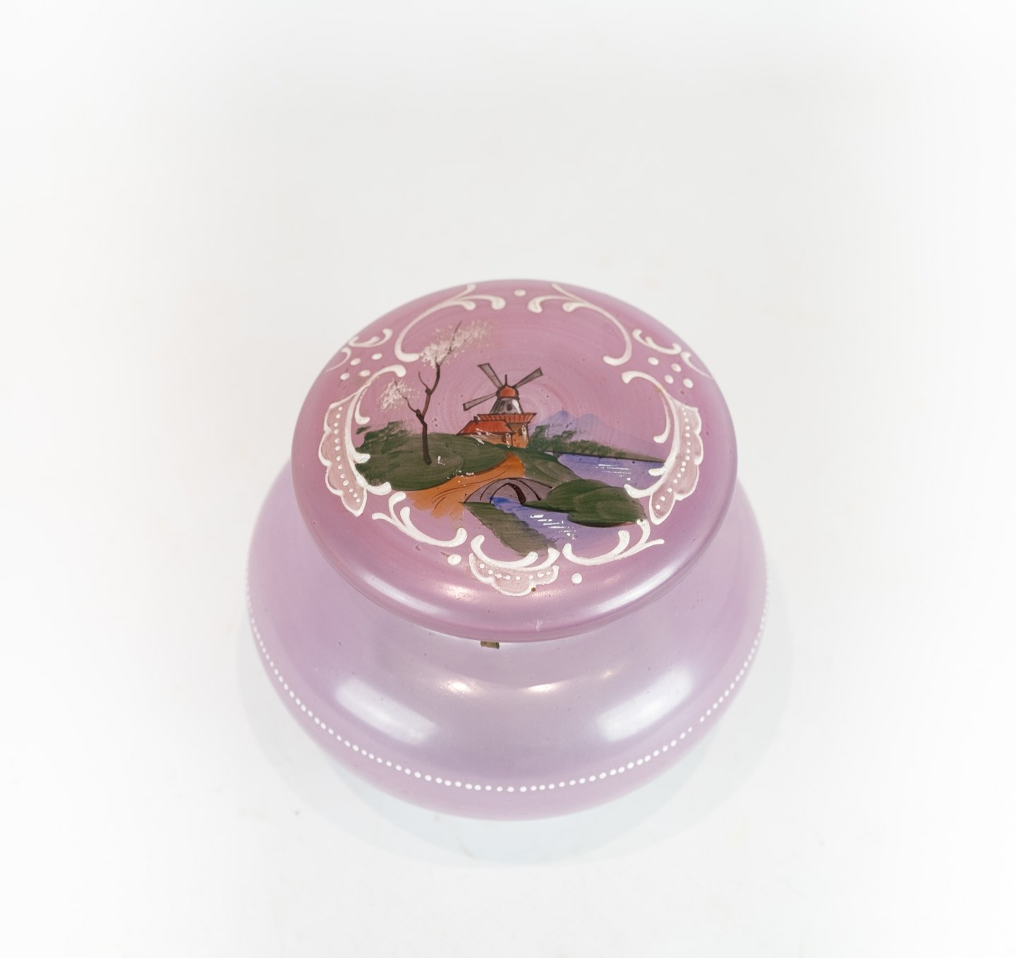 Bomboniere of light pink opal glass decorated with mill from the 1860s.