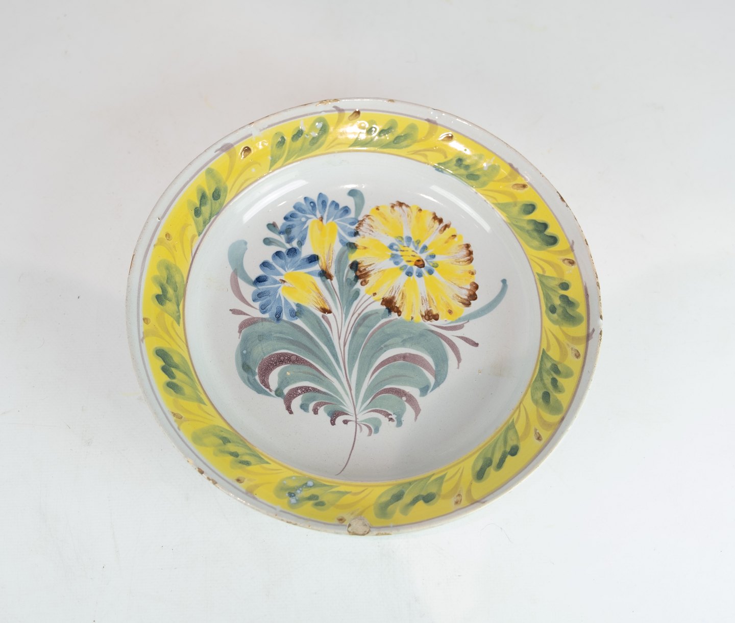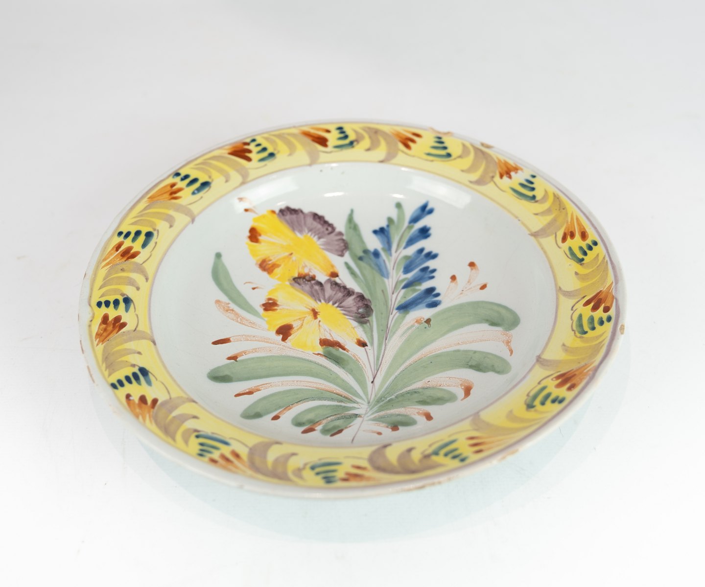 To Kelling Husen tallerkner dekoreret i gule farver med forskellige motiver af tysk fajance fra 1780.