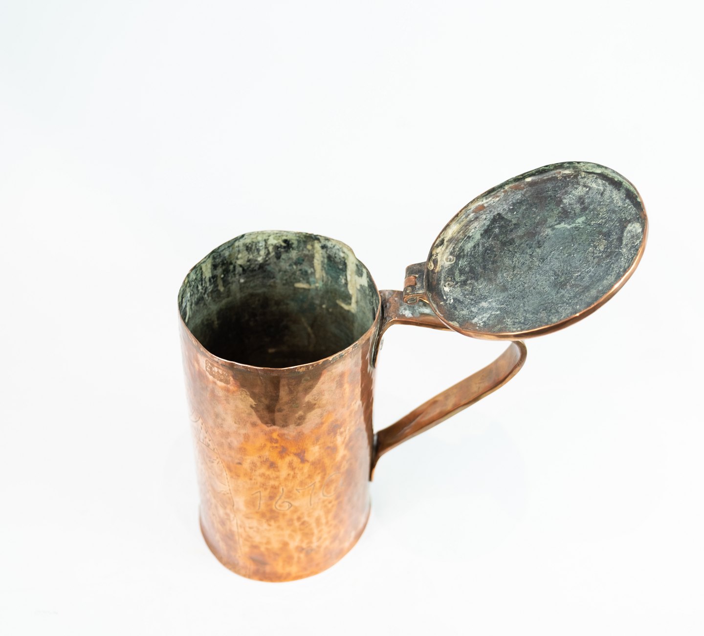 Copper jug with lid and engravings from Denmark around the 1820s and in great condition.