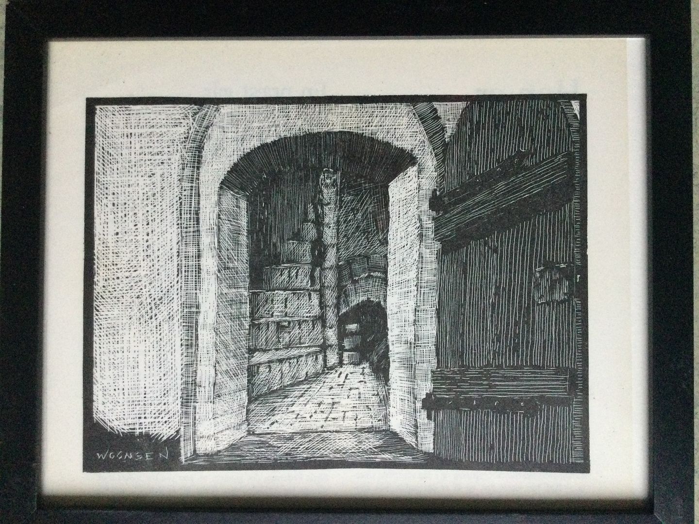 Træsnit af Carlo Wognsen - Åben dør til Klokketårn.