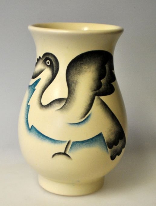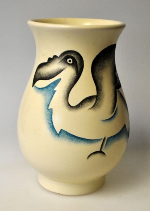 Michael Andersen & Søn art deco vase, 3219, 20. årh. Bornholm, Danmark. Ler. Lys glasur med håndbemalet dekoration i form af en pelikan. Signeret. H: 16 cm.