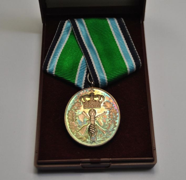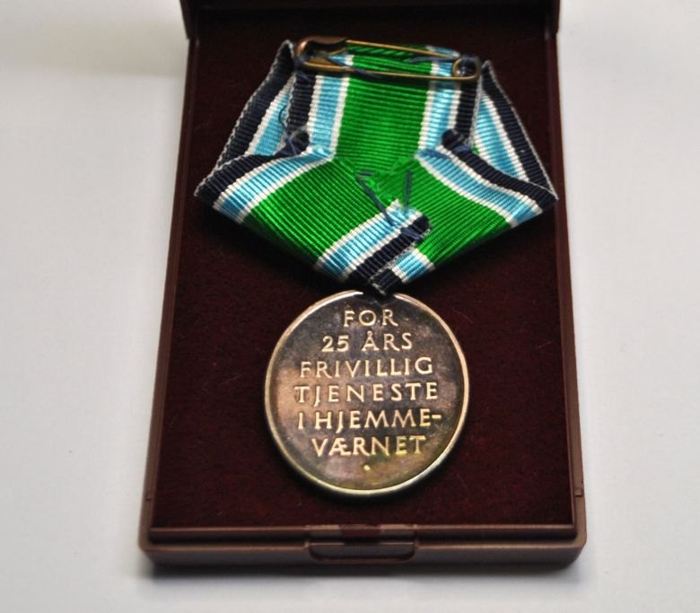 The Home Guard's 25 year sign, 20th century Denmark. With accompanying ribbon and box. 3.5 x 3 cm.