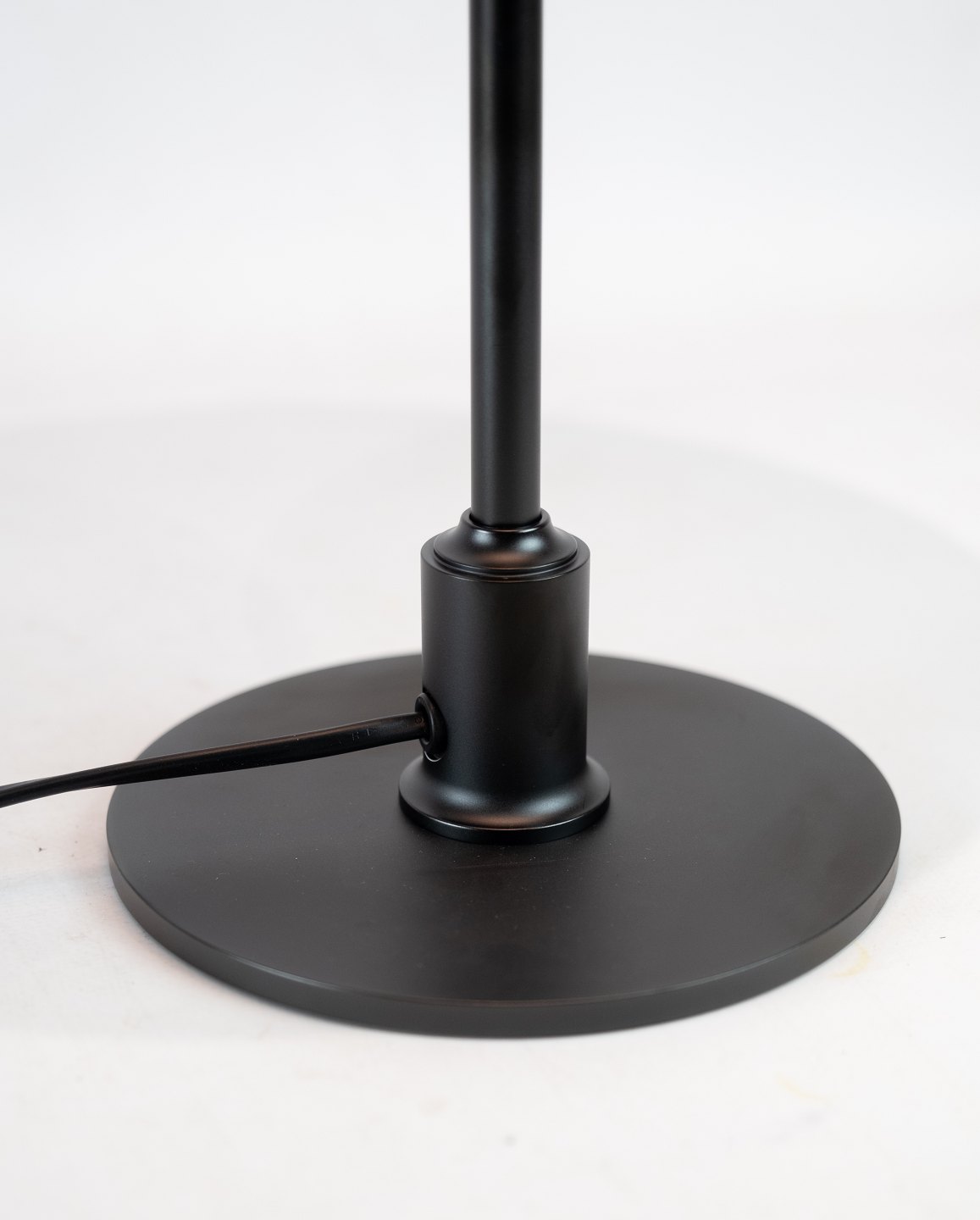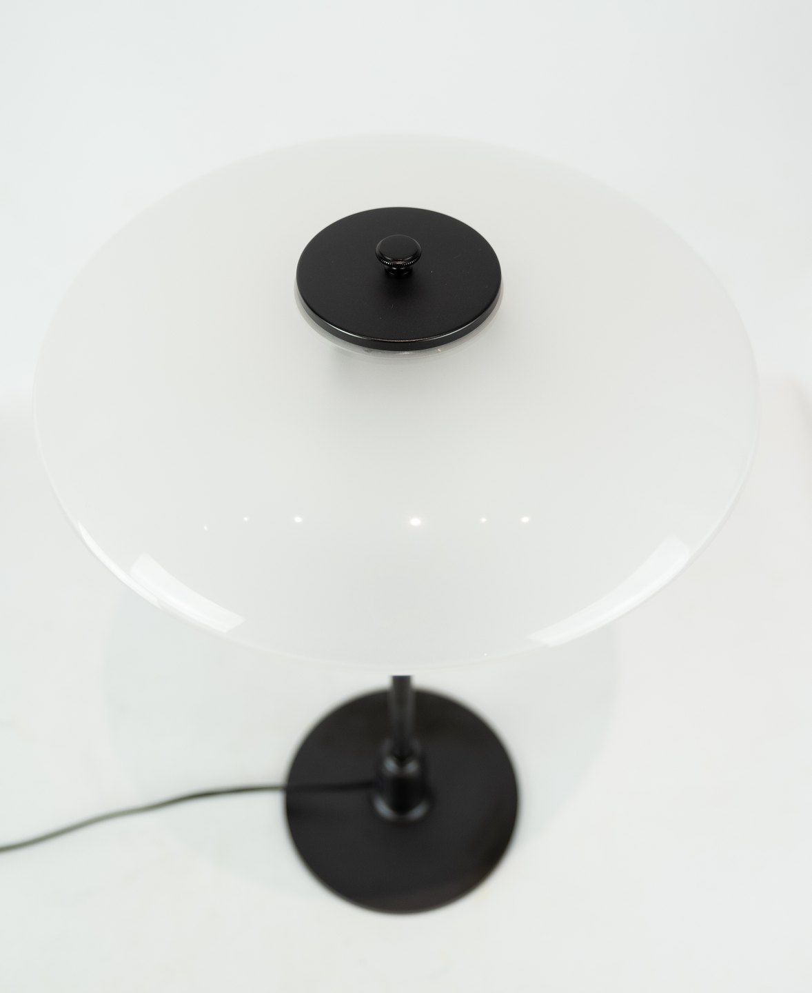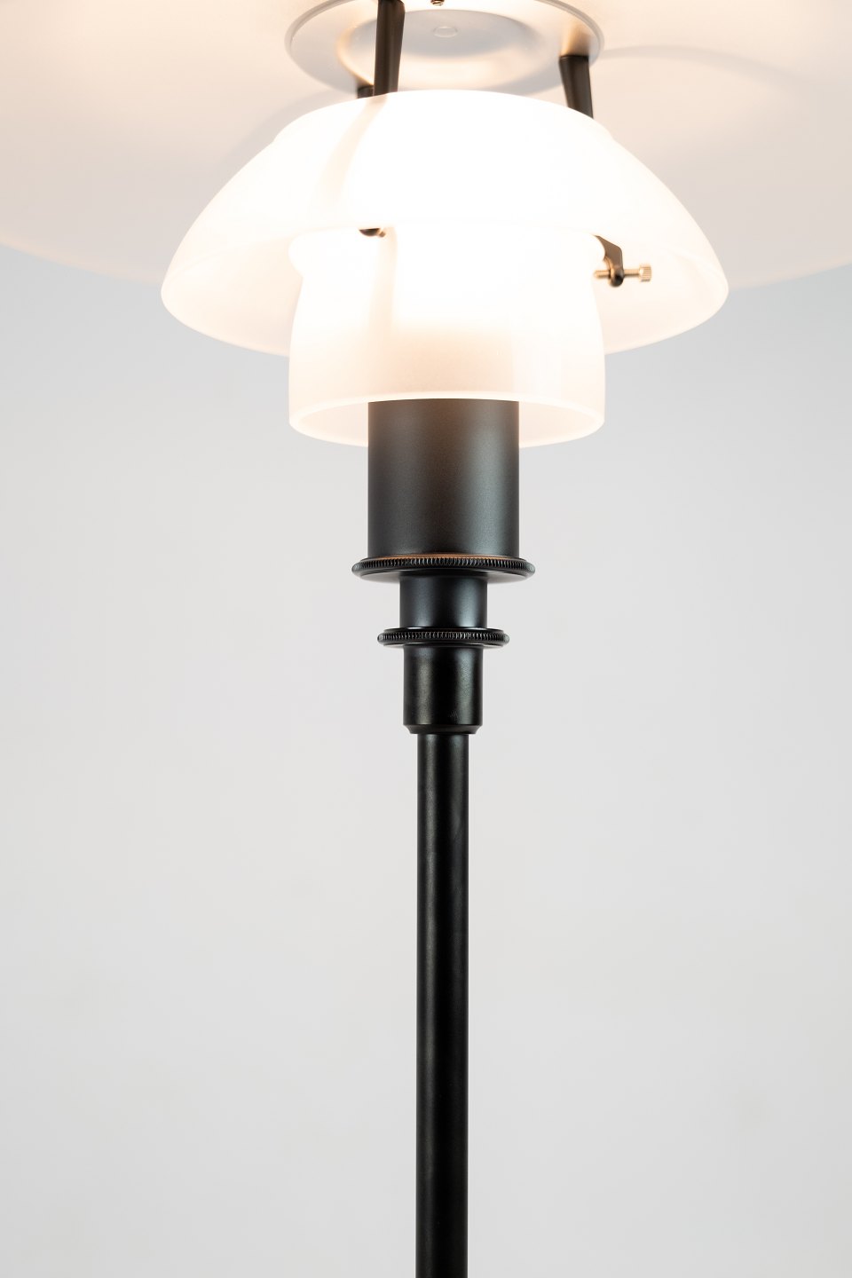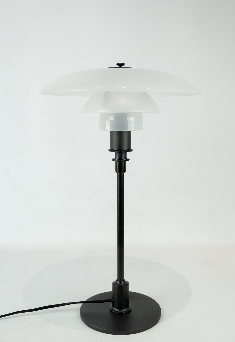 PH 3/2 bordlampe med sort stel og mat glas skærme, designet af Poul Henningsen og fremstillet hos Louis Poulsen.