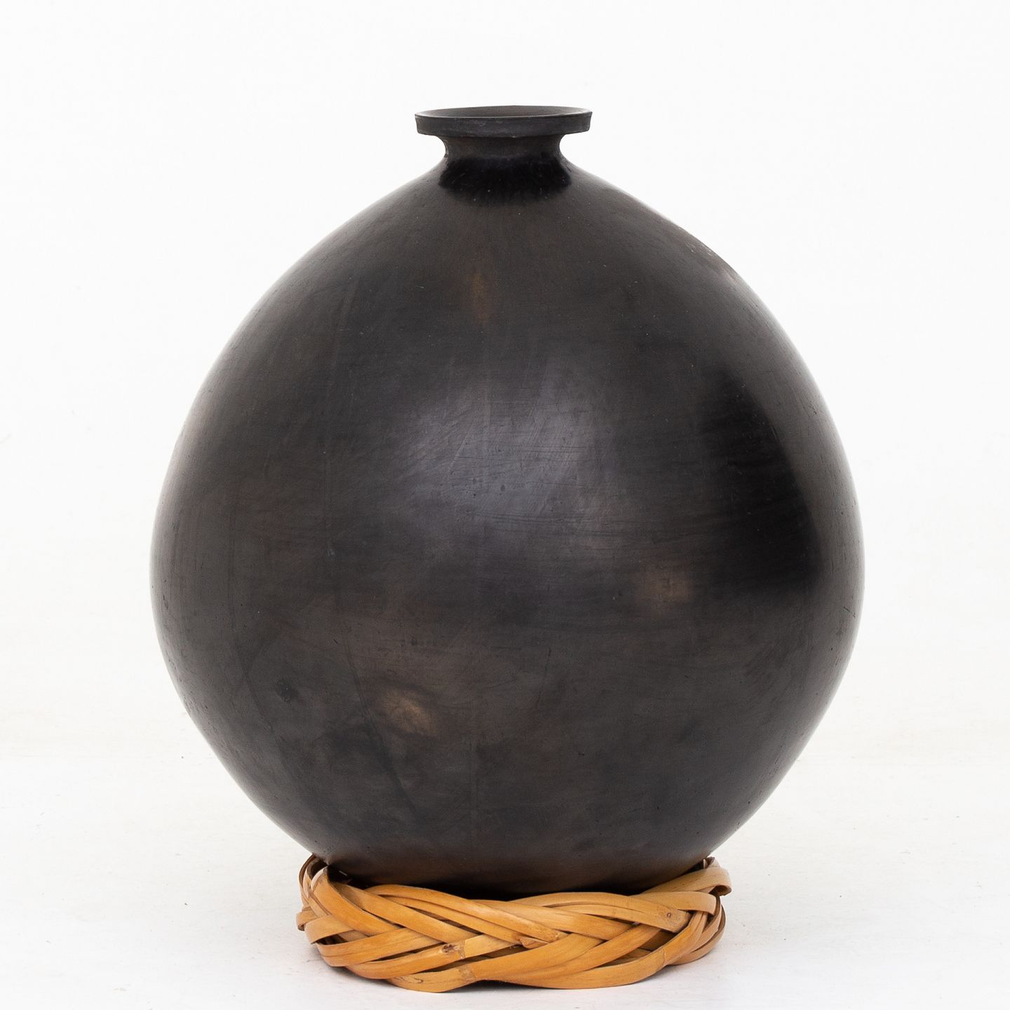 Stor rundbundet krukke i mørkbrændt lertøj på base i flettet bambus.