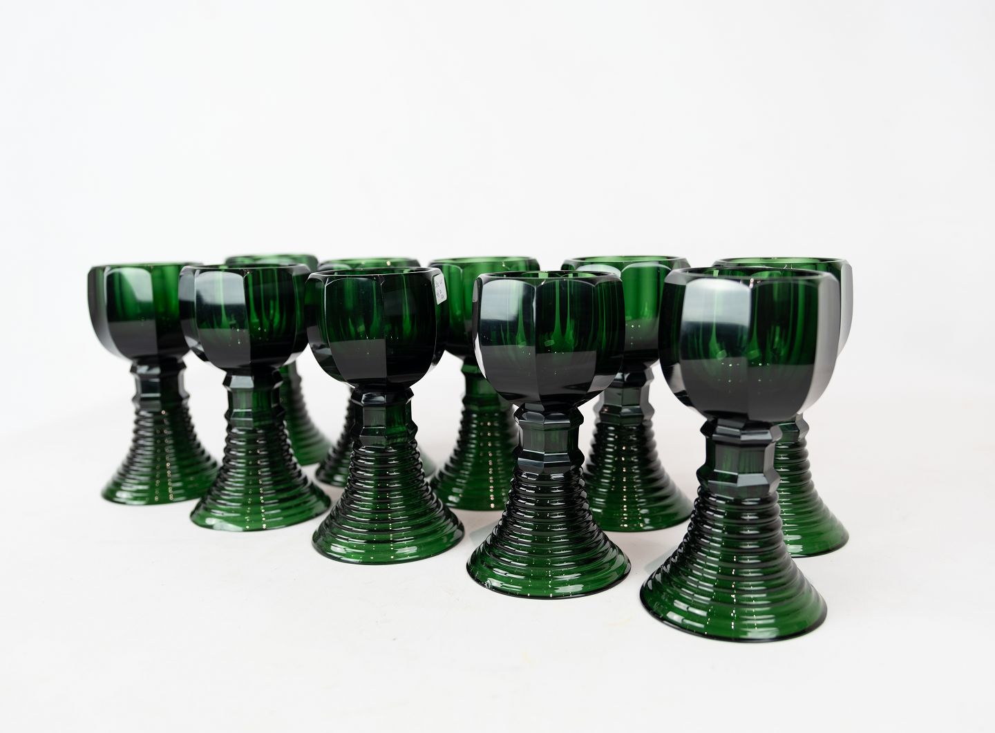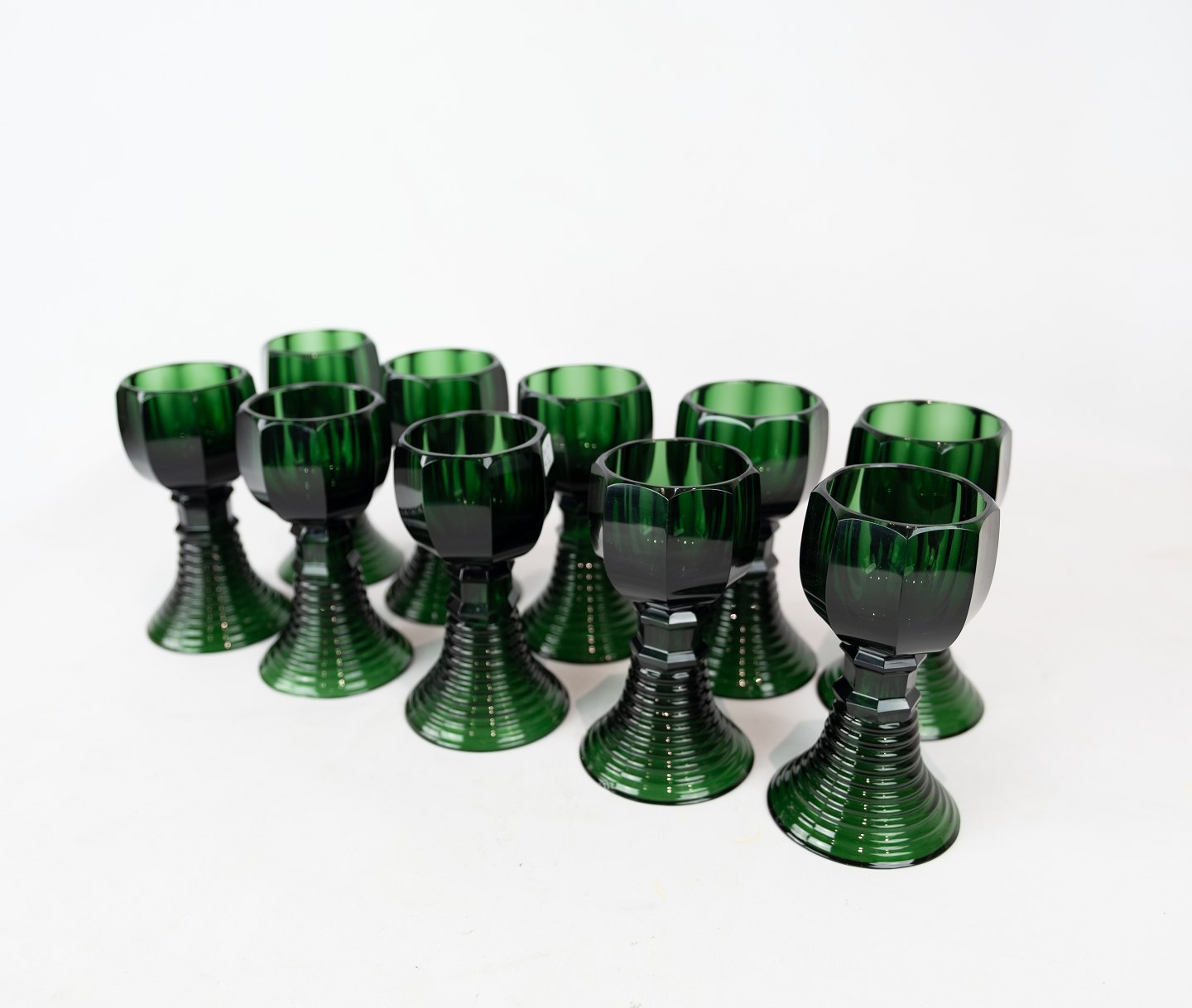 Sæt af ti mørke grønne Rømer glas, i flot brugt stand fra 1920erne.