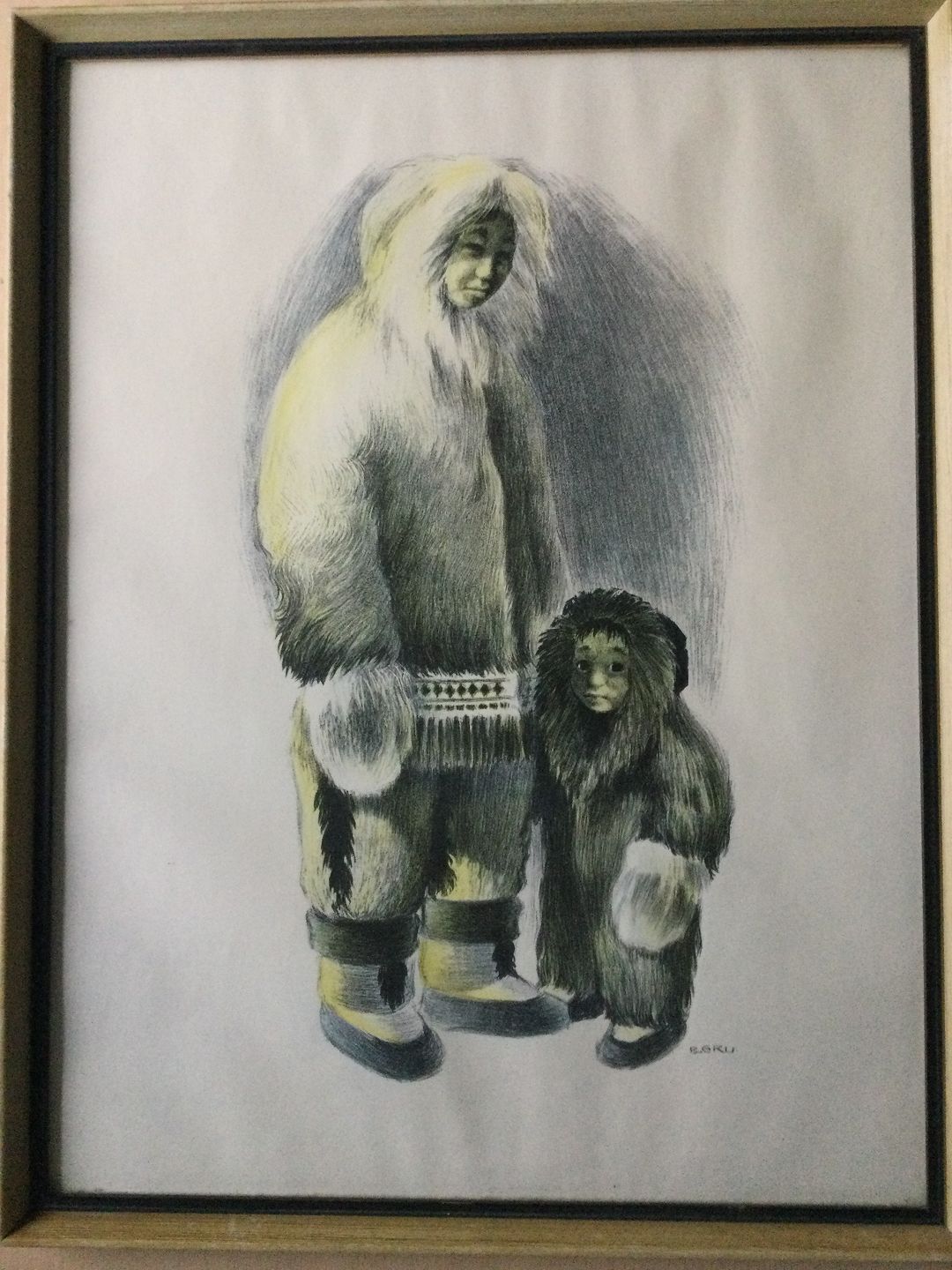 Litografisk tryk af B. Gru - 2 Grønlændere i sælskindsdragter.