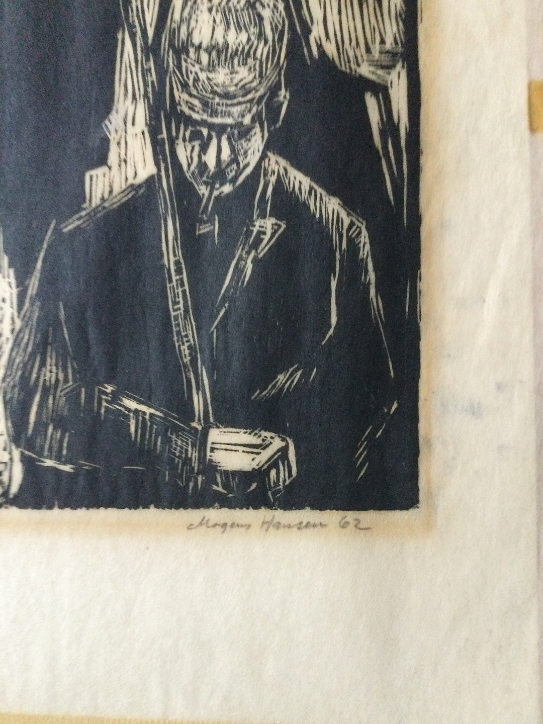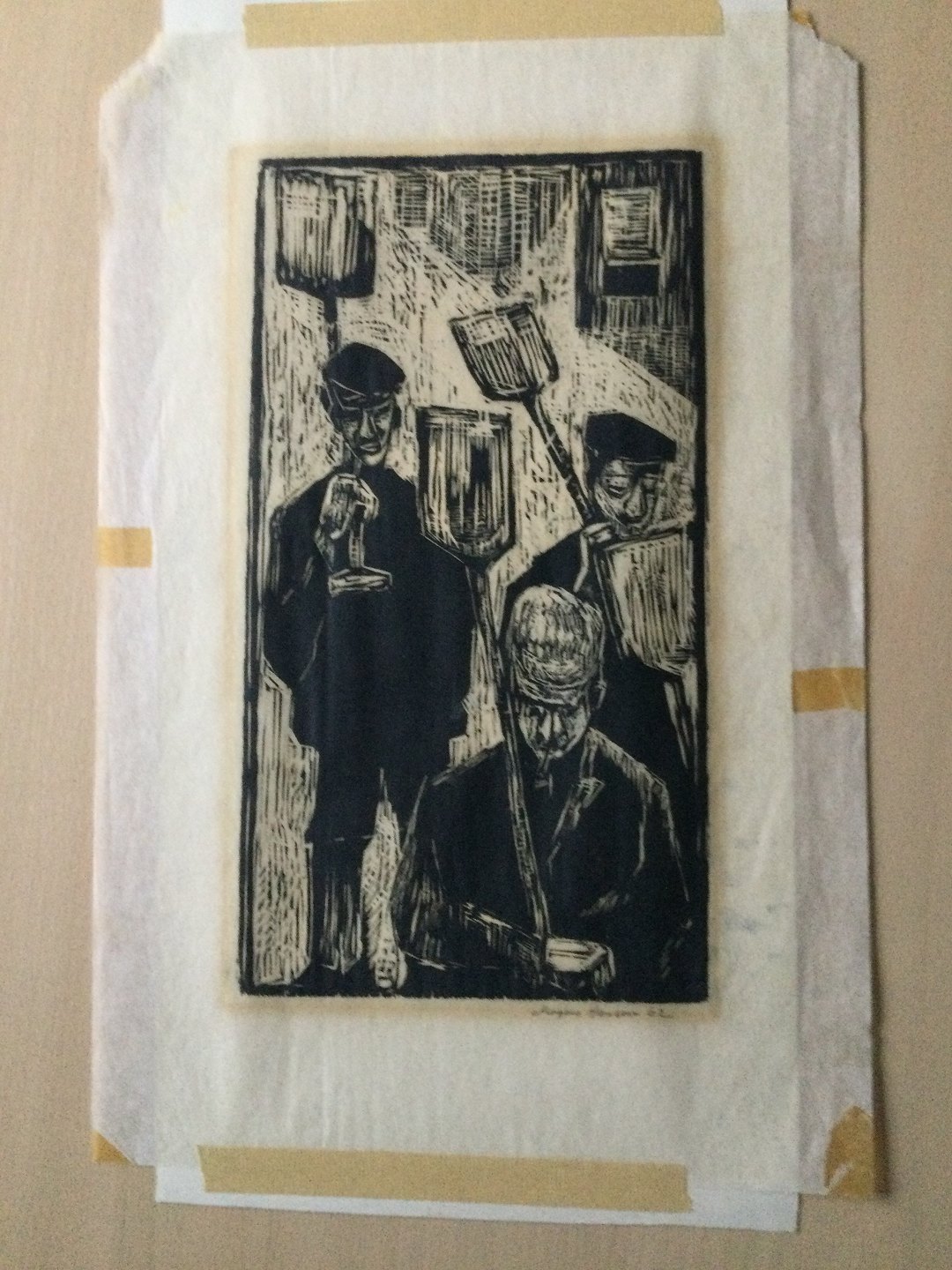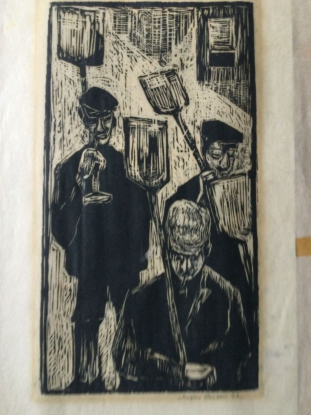 Træsnit af Mogens Hansen 1962 - Arbejdere med skovle.