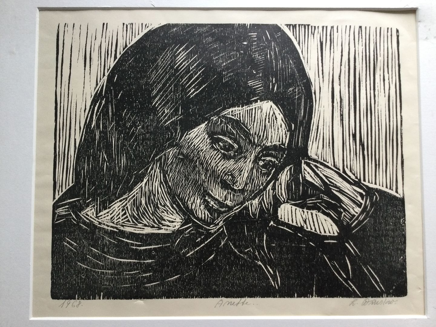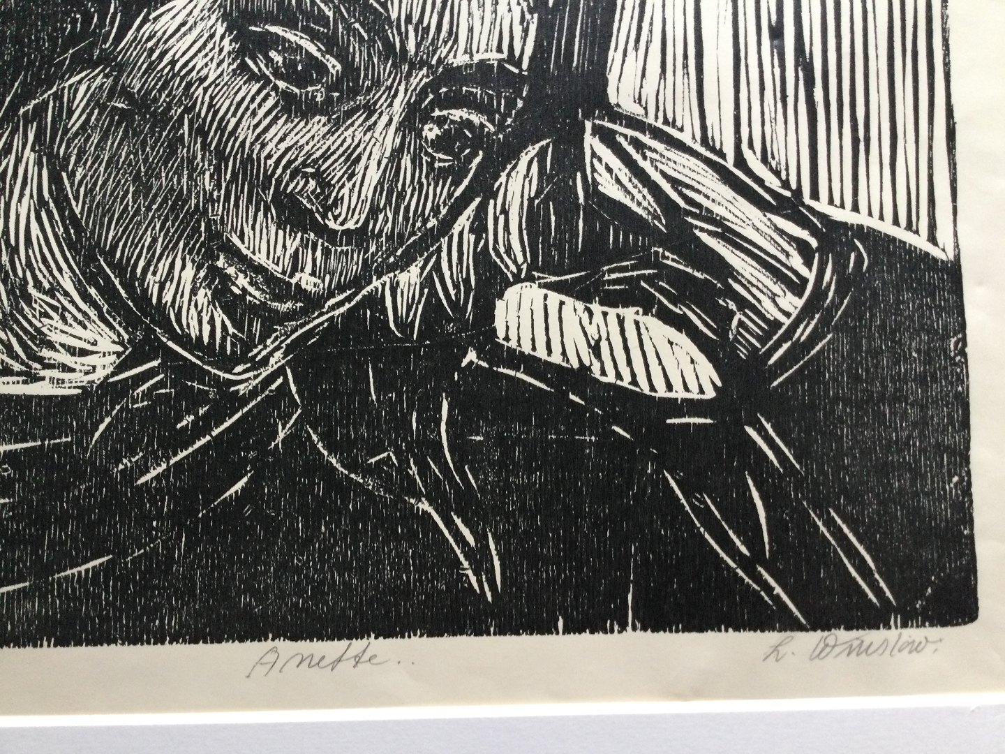 Linoleumssnit på papir monteret på passepartout.
