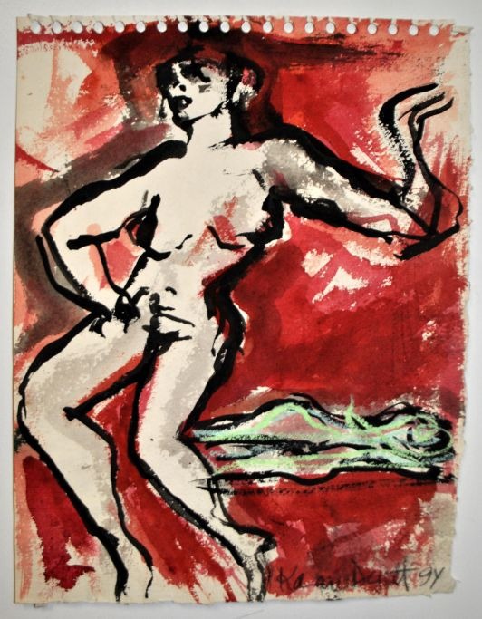 Degett, Karen (1954 - 2011) Danmark: Nøgne kvinder. "The Polish ballet". Tusch, pastel og akvarel på papir. Signeret 1994. 36 x 27 cm.  Uindrammet.  Proveniens: Kunstnerens bo. Denne skitse er lavet under et af kunstnerens besøg i Polen