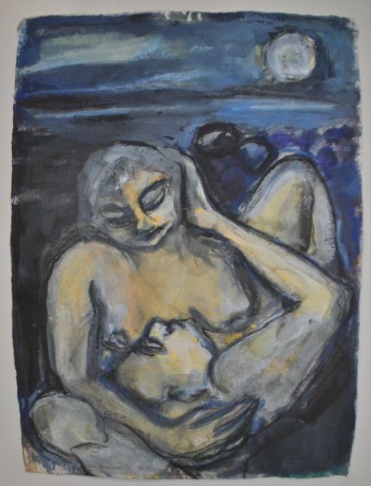 Degett, Karen (1954 - 2011) Danmark: Et elskende par på stranden. Usigneret. Pastel/Tusch/akvarel på papir. 78 x 55 cm. Uindrammet. Proveniens: Kunstnerens bo.