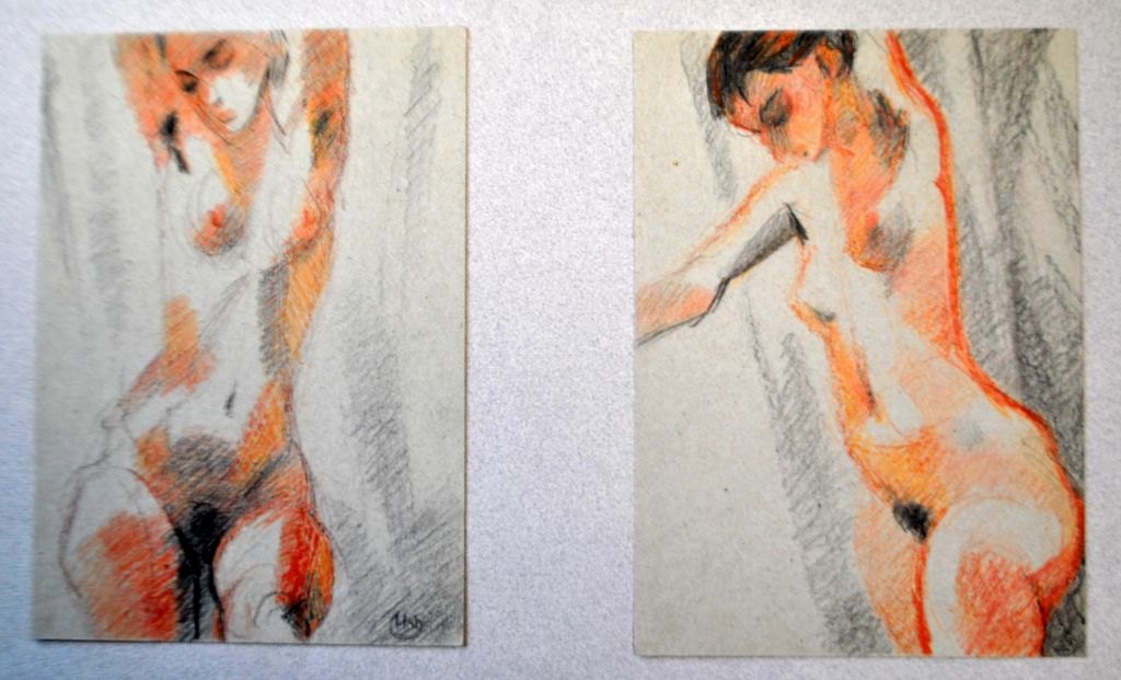 Kühn-Nielsen, Helge (1921 - 1997) Danmark: Modeller. Farvekridt på brunt papir. Signeret. 21 x 15 cm. og 21 x 15 cm. 2 stk.
