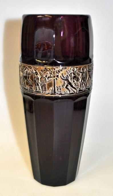 Vase, 11 kantet. Moser Karlsbad, Tjekkiet, Art deco, ca. 1920. Violet presset glas. Med forgyldt frise med scenerier. H.: 20 cm.