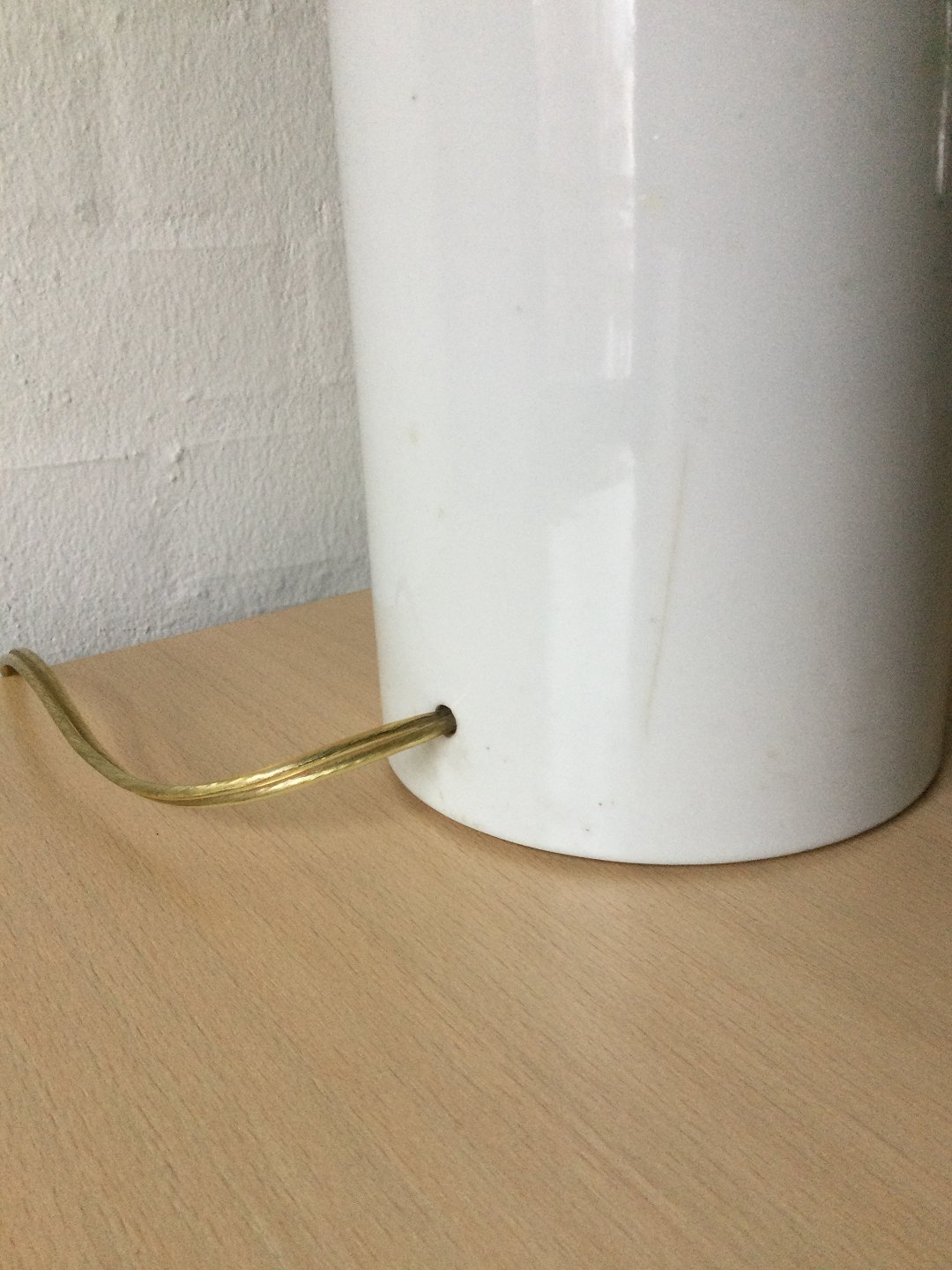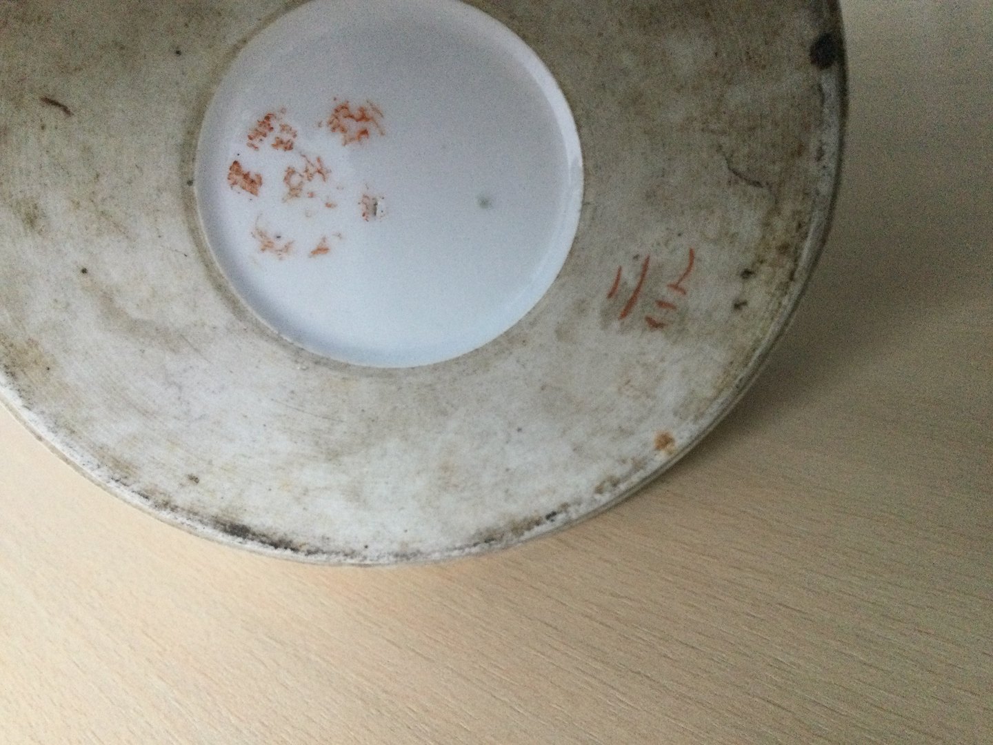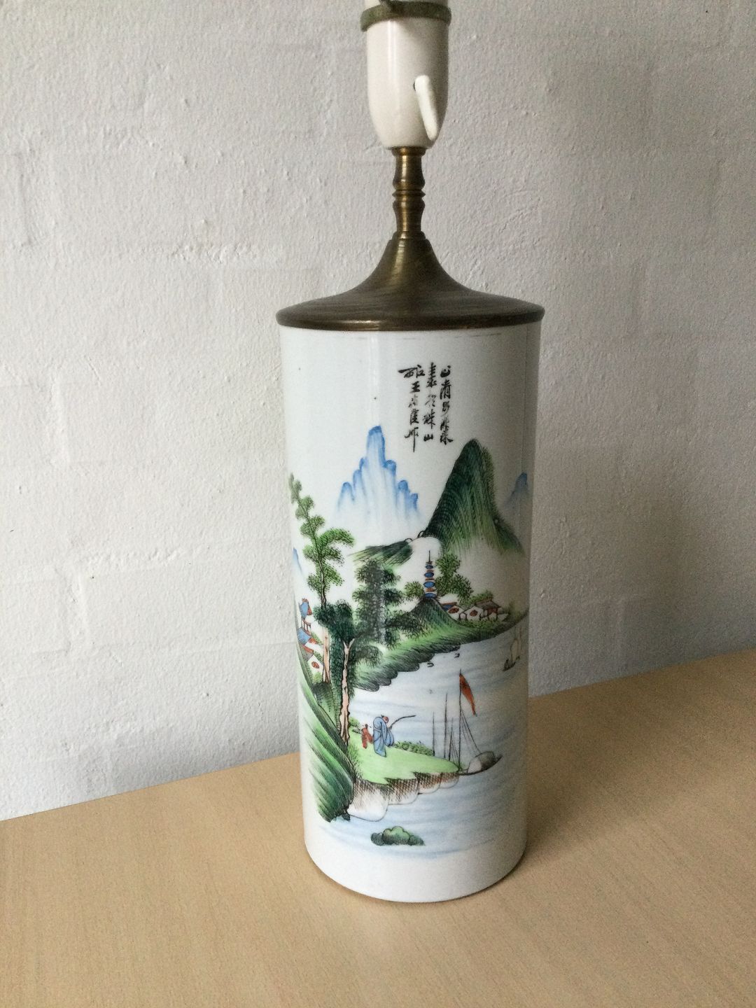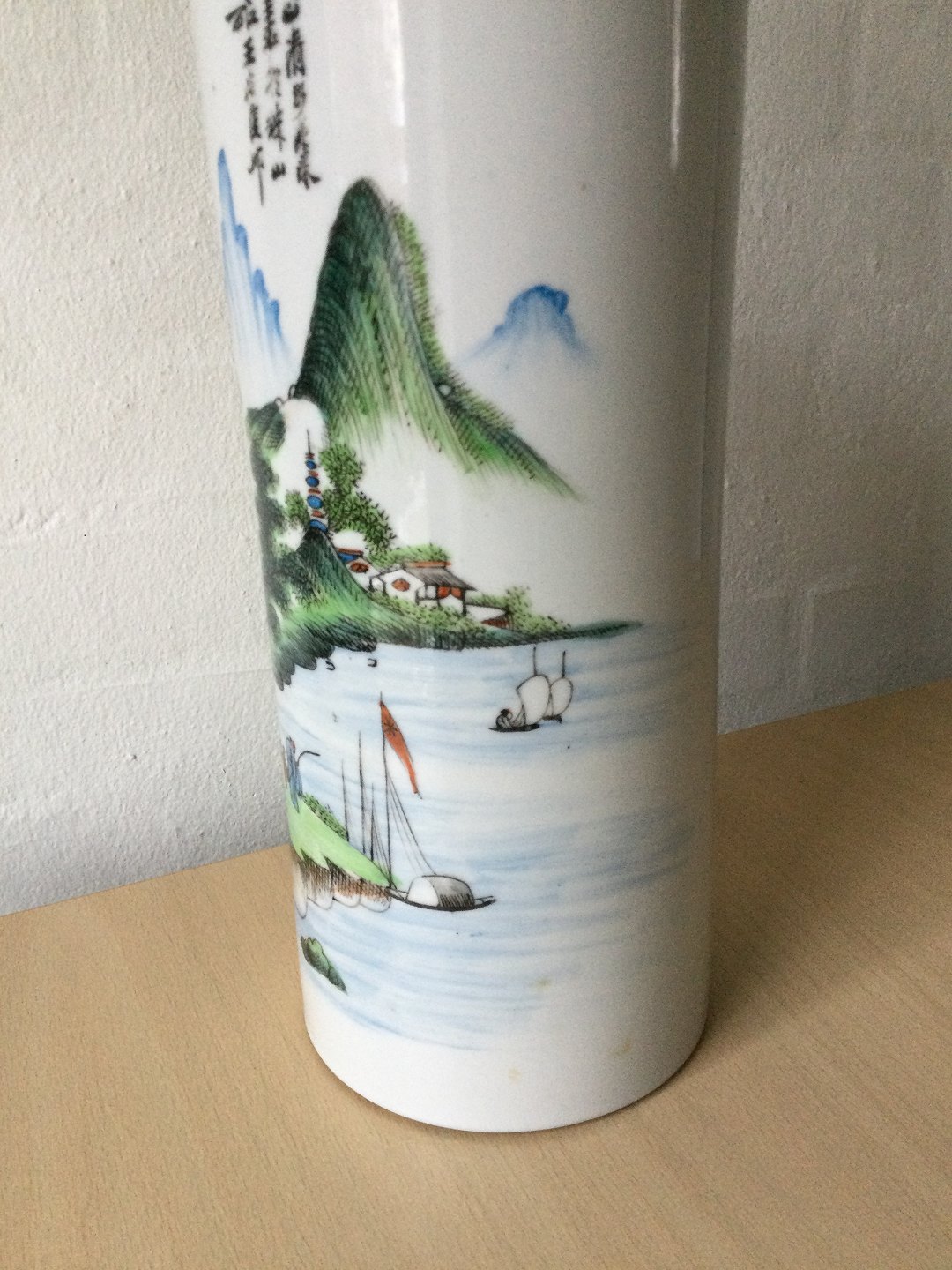 Polykromt dekoreret med bjerge, sø, både og fiskere i landskab.