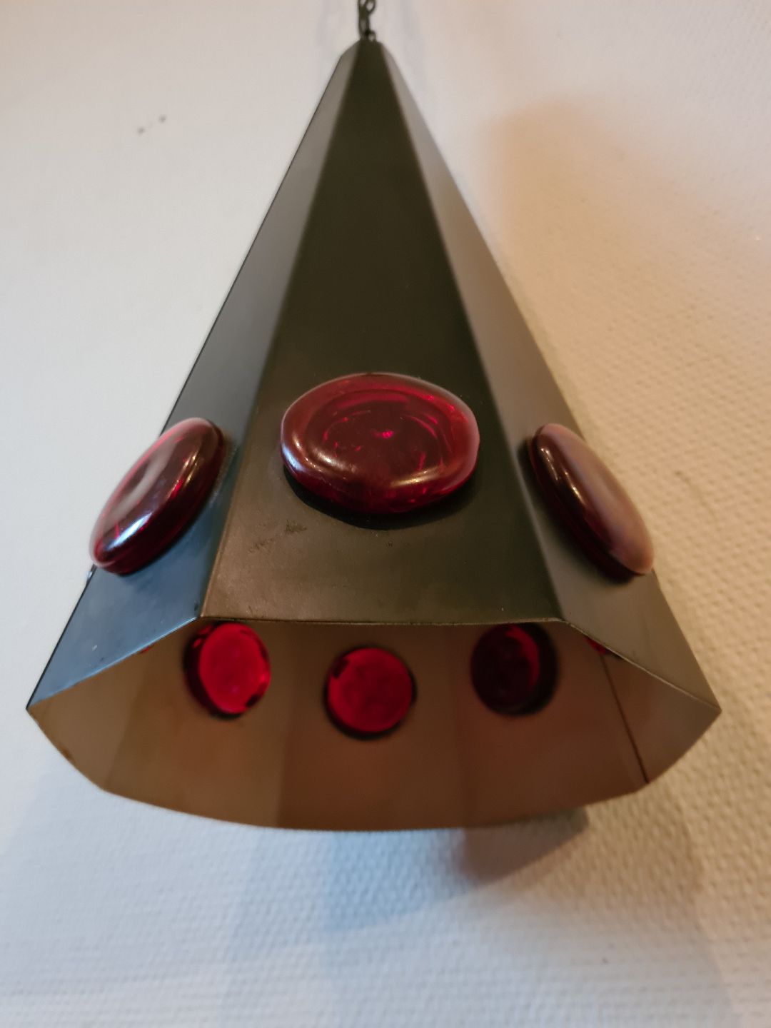 Sort malet metal lampe med røde hinkesten fra 1970erne.