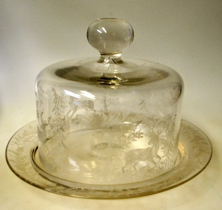 Cheese bell with deer motif and accompanying dish, approx. 1910. Holmegård, Denmark.