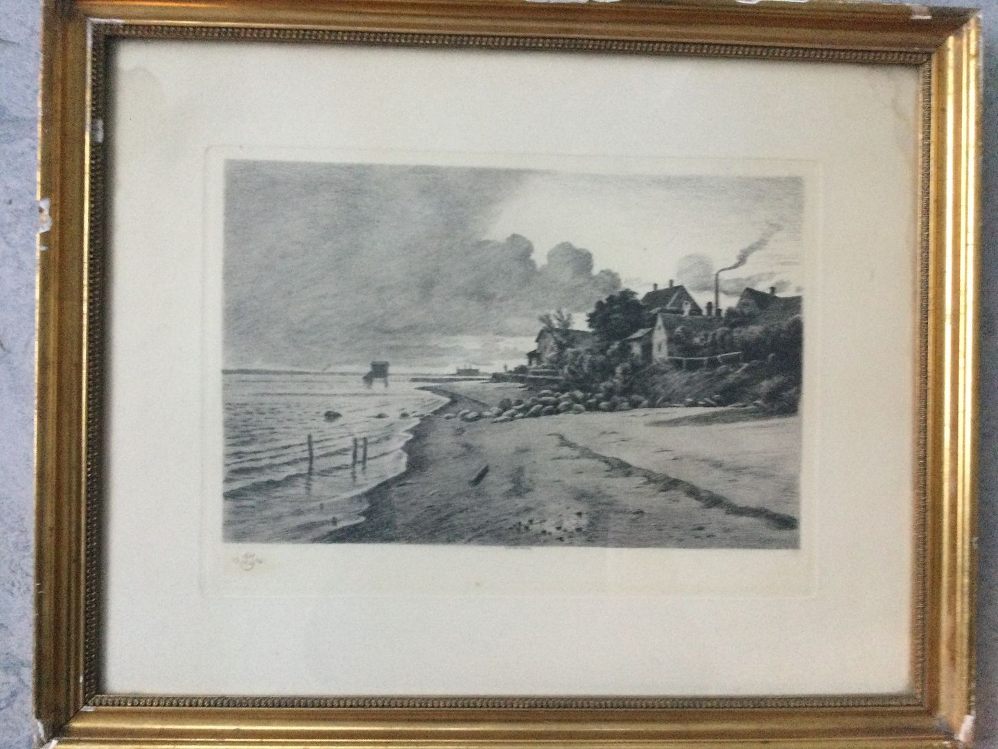 Radering af Louis Jensen 1906 - Strandparti Hellebæk med Kronborg Slot i baggrunden.