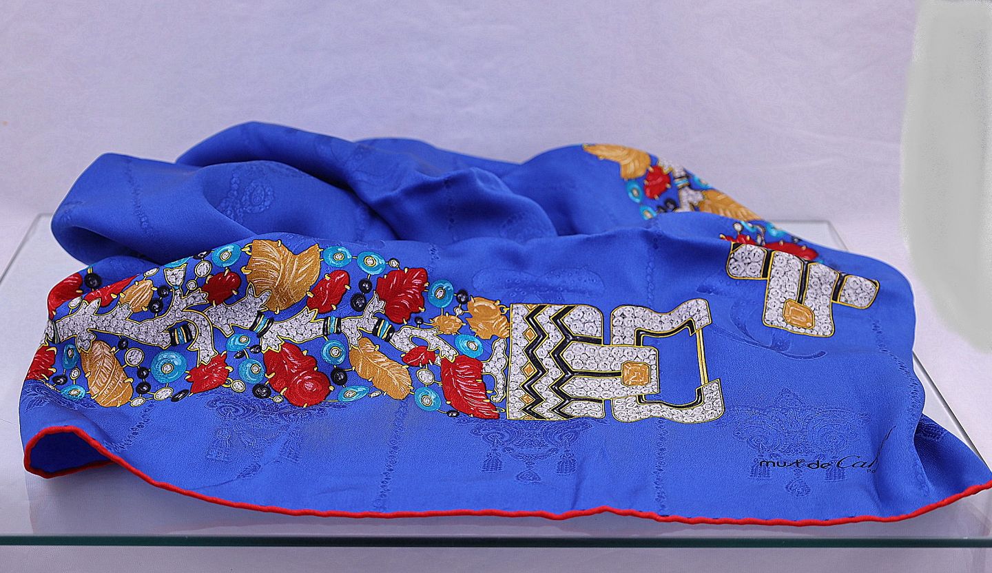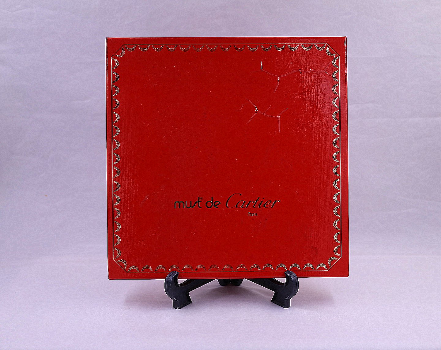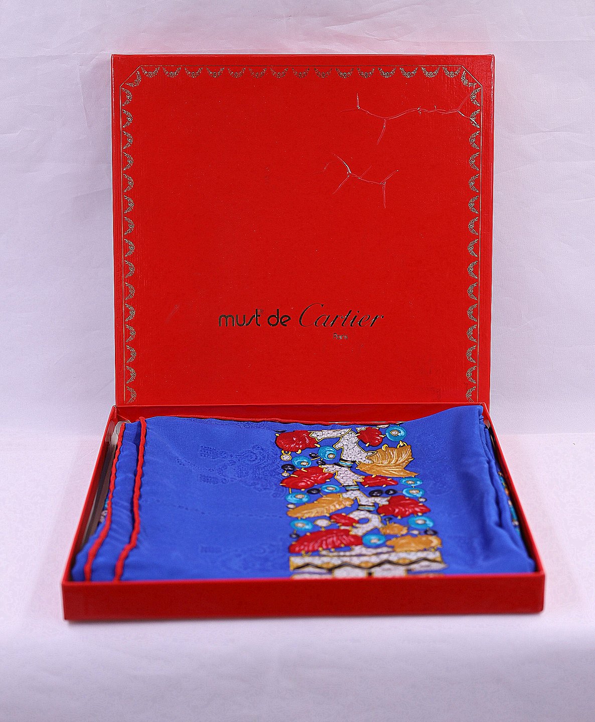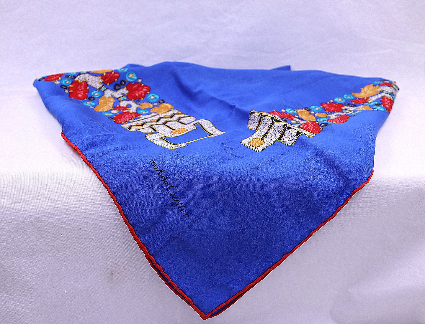 Text available in Danish: Must de Cartier, blåt silketørklæde i originalæske. Firkantet blåt silketørklæde, tørklædet er dekoreret med en bort, hele vejen rundt, borten ligner et bælte med spænde.