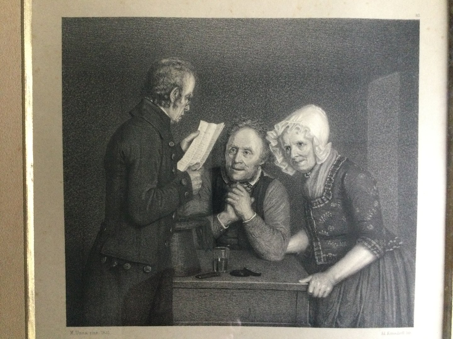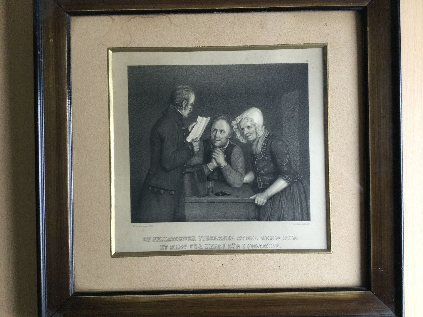 Litografi af Ad. Kittendorff - En Skolemester forelæser et par Gamle Folk et brev.
