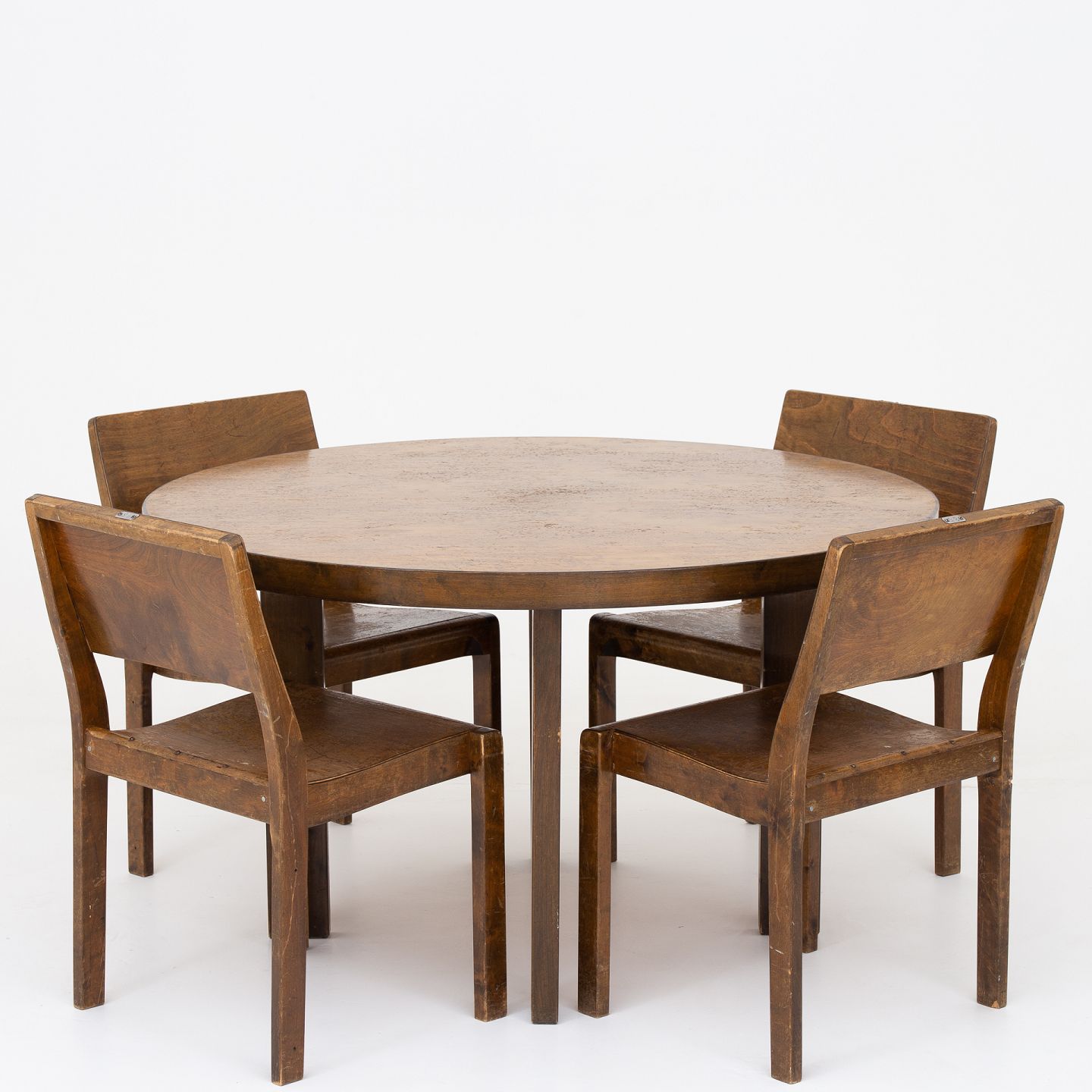 Sjældent spisebordssæt i patineret masurbirk. Spisebord (model 91) og fire stole (model 611).
