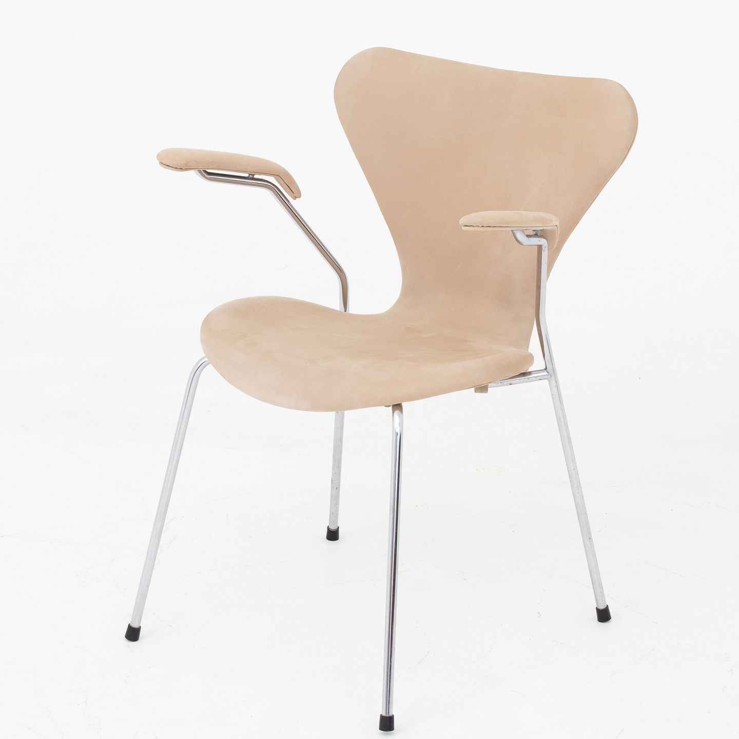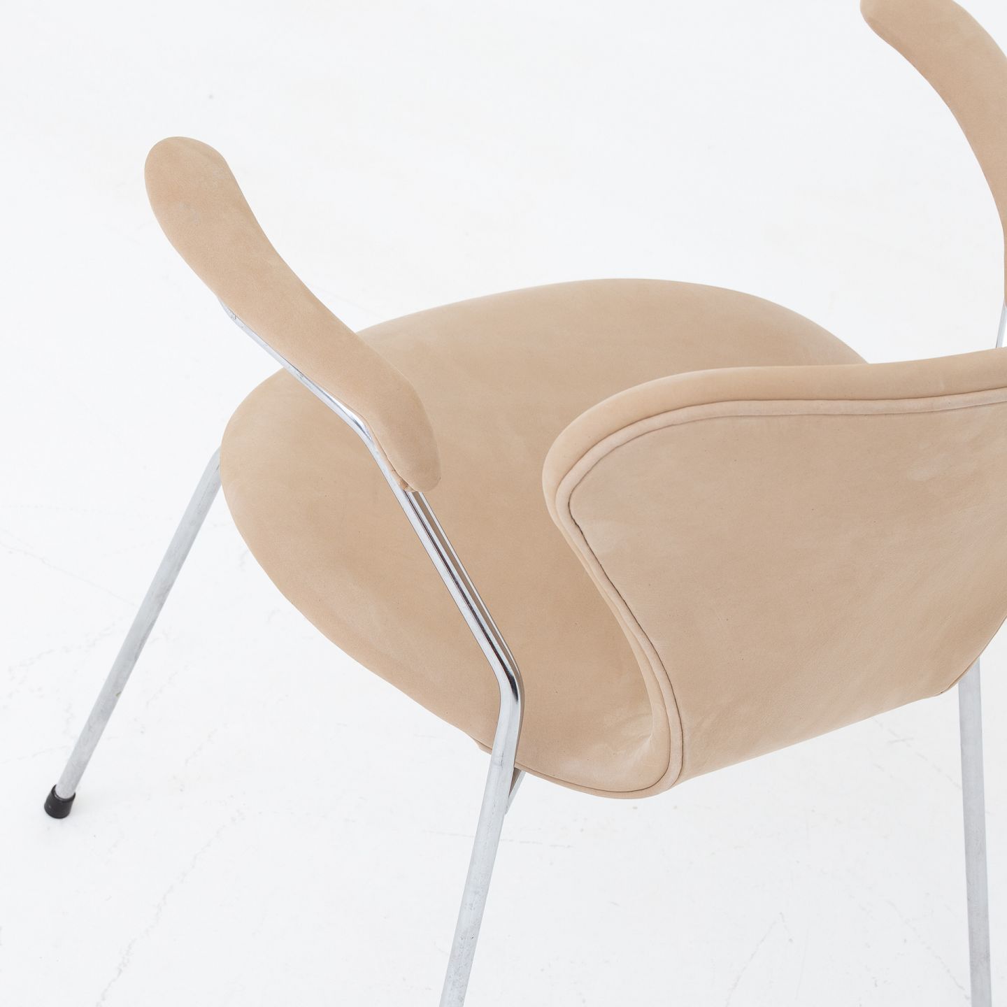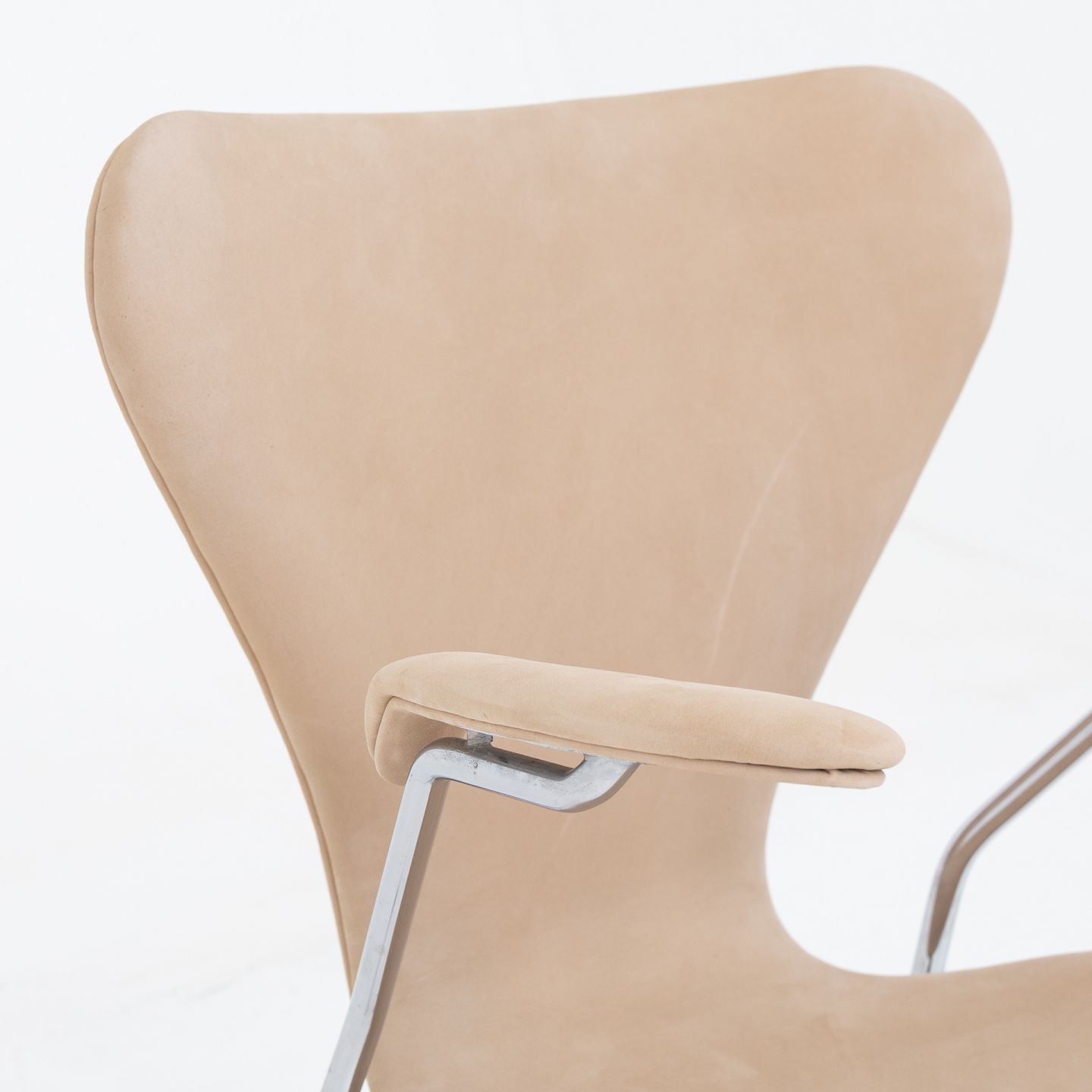 AJ 3207 - Reupholstered armchair in Royal Nubuck leather (Ecru) on steel frame. KLASSIK offers upholstery of the chair with fabric or leather of your choice.