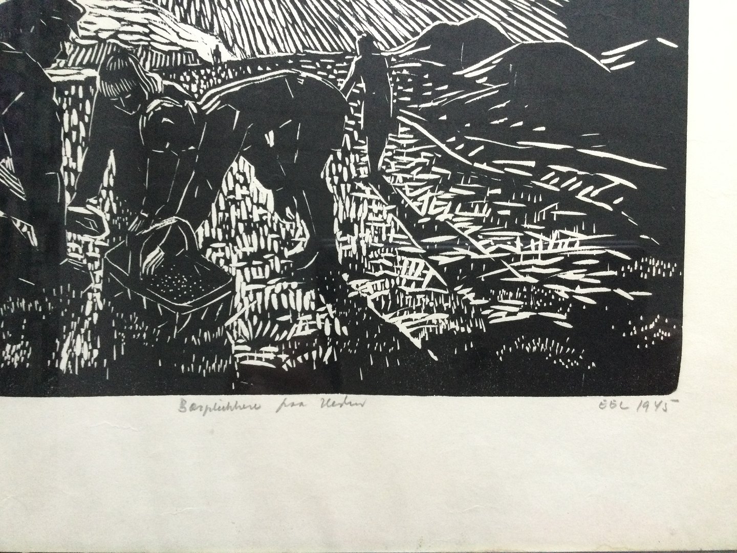 Linoleumssnit af Knud Eel - Bærplukkere på Heden 1945.