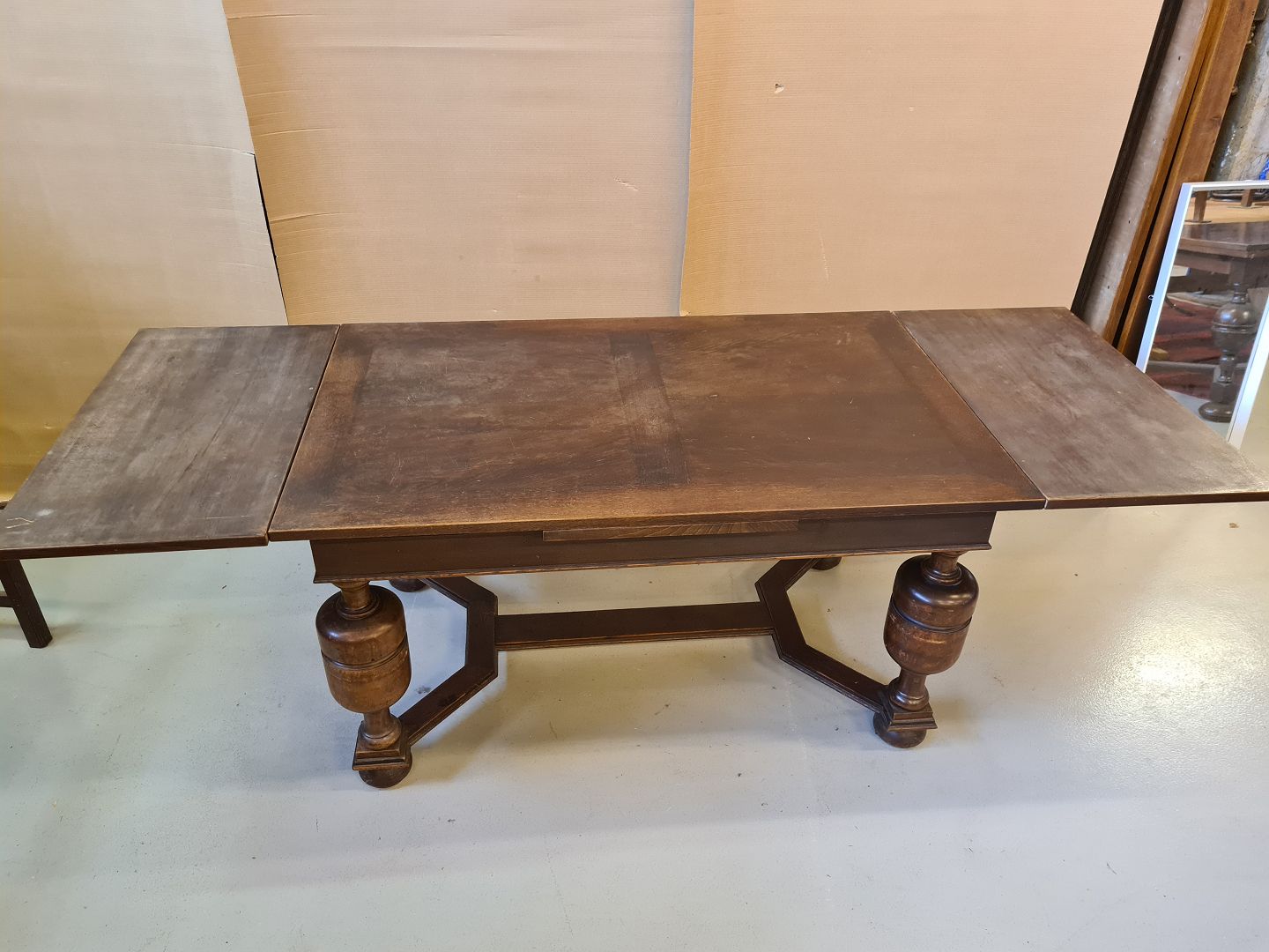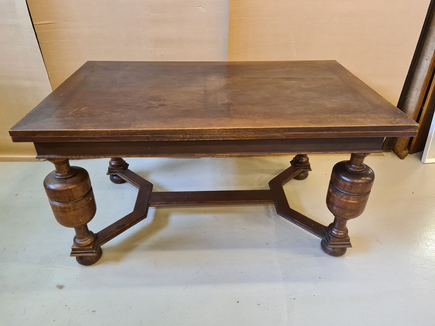 Egetræs spisebord med hollandsk udtræk fra 1930´erne. Fremstår funktionsdygtigt, godt og stabilt dog med en lille finérskade omtrent midt på bordpladen.