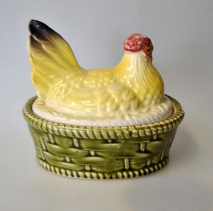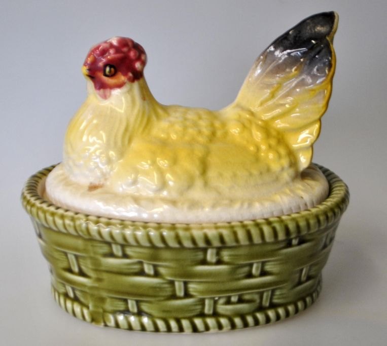 Fajance høne, 19. årh. Tyskland. Polykrom dekoreret. Flettet rede af grønligt glasur. Med låg. H.: 15 cm. L.: 16 cm.