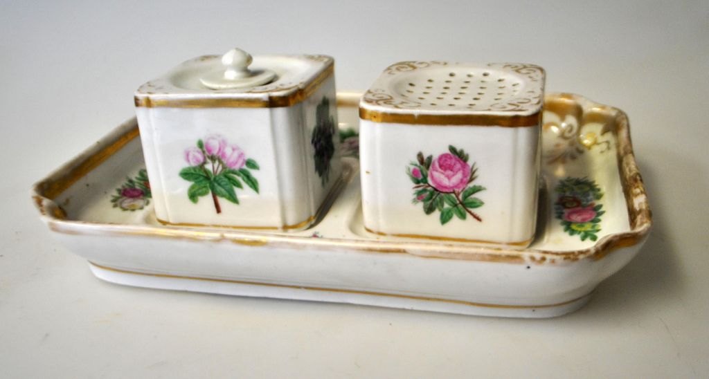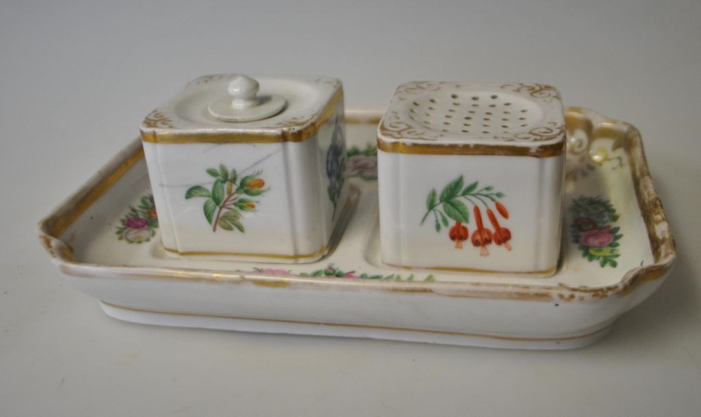 Royal Copenhagen porcelain writing set, 19th century. Consisting of tray with ink house and sand house. Decorated with hand-painted flowers and gildings. Stamped. L .: 21.5 cm. W .: 15 cm.