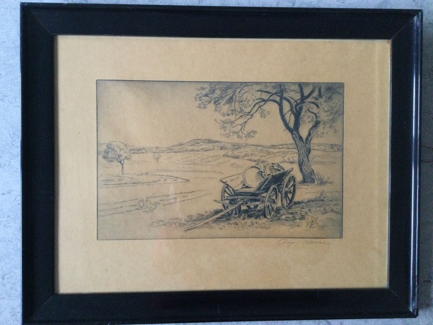 Gammel landbrugsvogn ved træ.