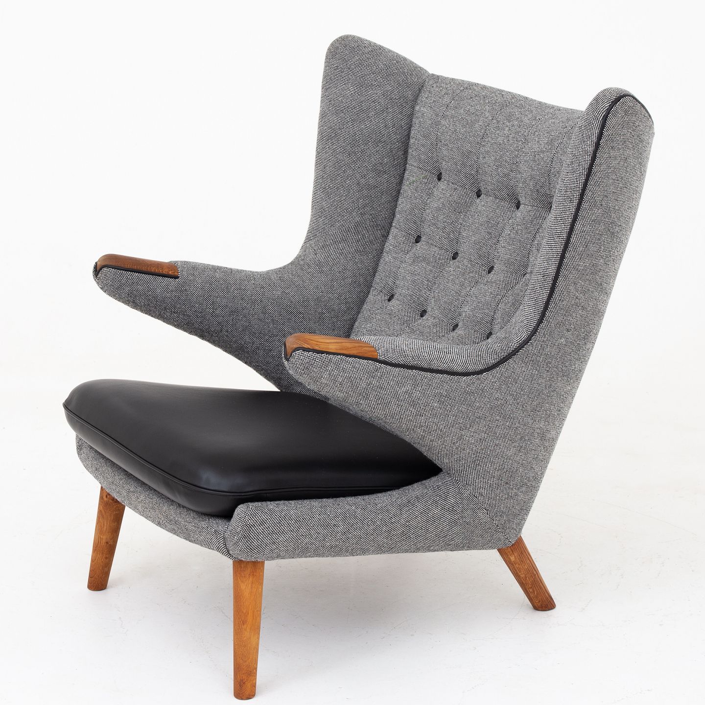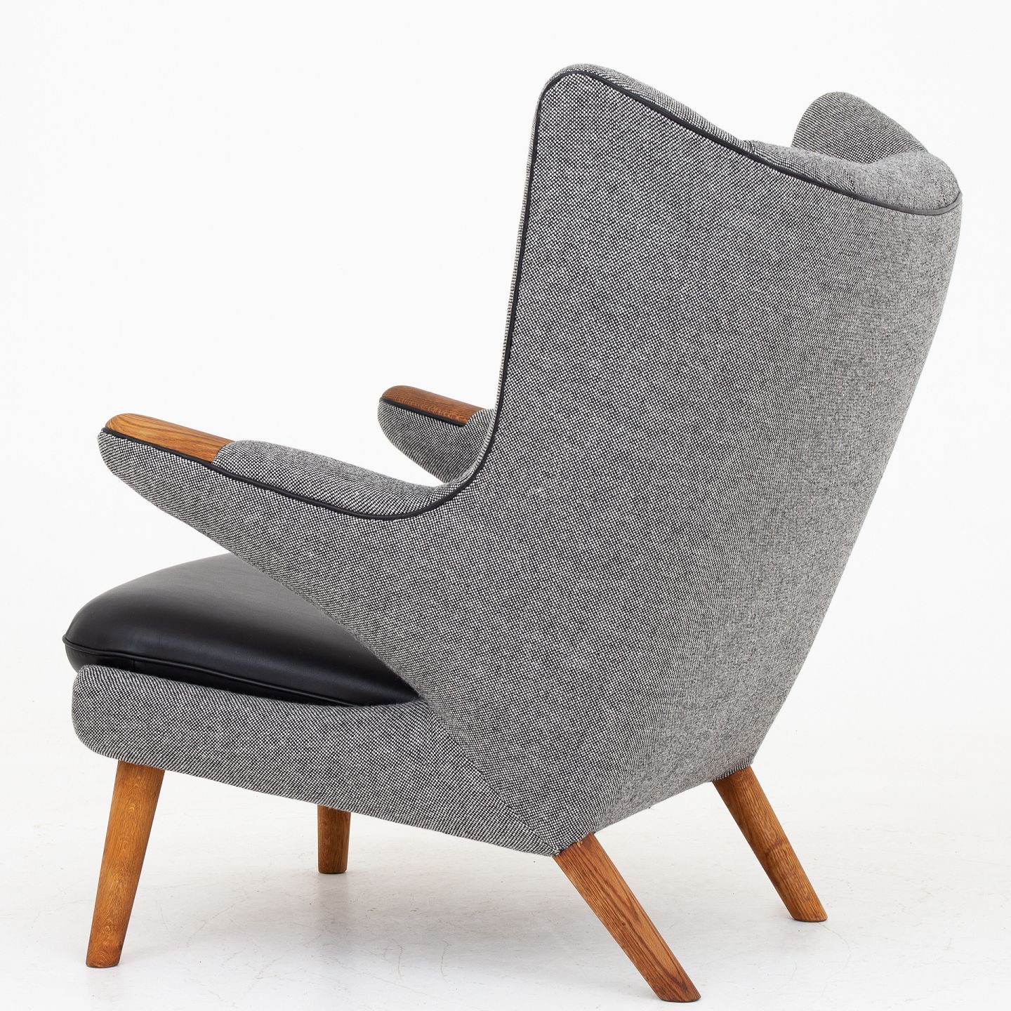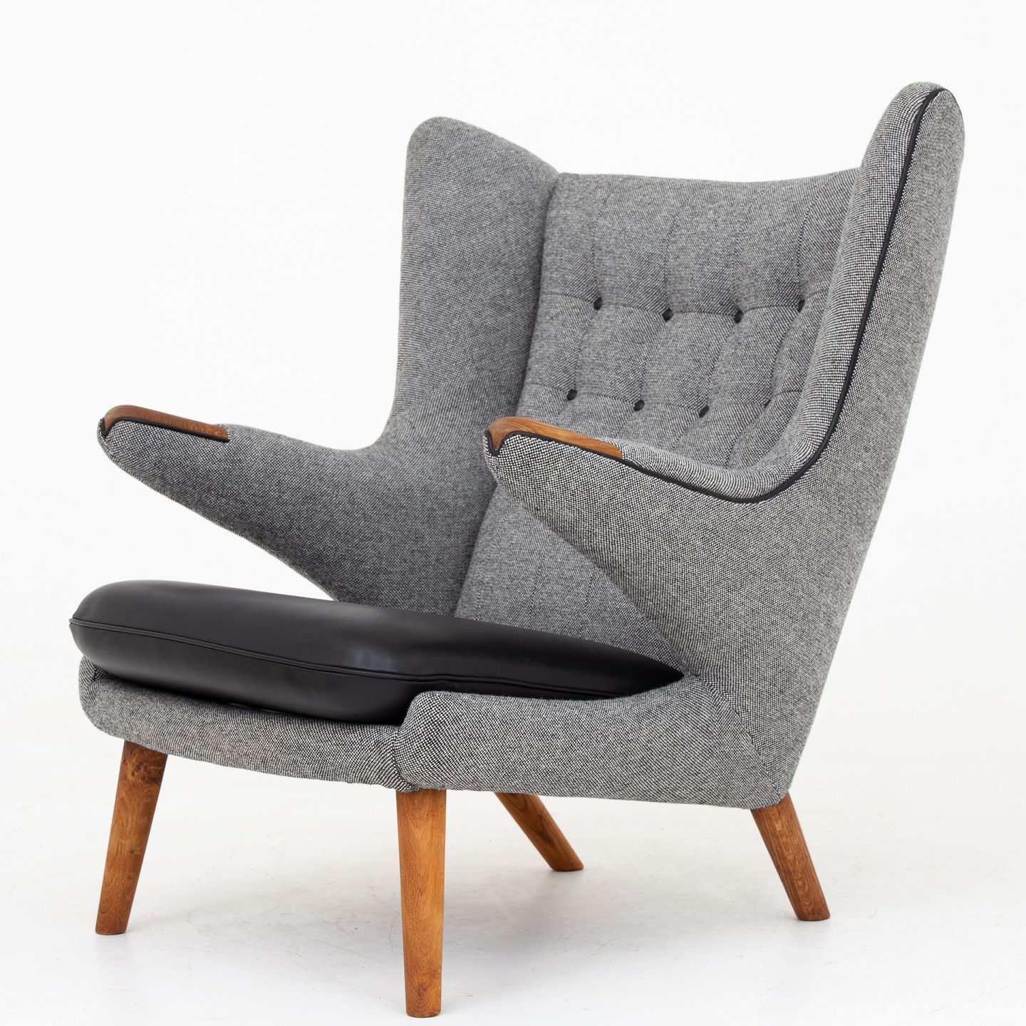 AP 19 - Reupholstered Papa Bear chair in Hallingdal 65 wool (code 166) w. seat and buttons in black leather. Paws and legs in oak. KLASSIK offers upholstery of the Papa Bear chair in fabric or leather of your choice.