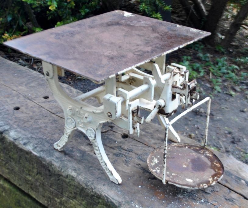 Antik apoteker vægt, hvidmalet, i støbejern, 19. årh. Danmark. H: 22 cm. Plade 30 x 25 cm. Senest justeret i 1962.