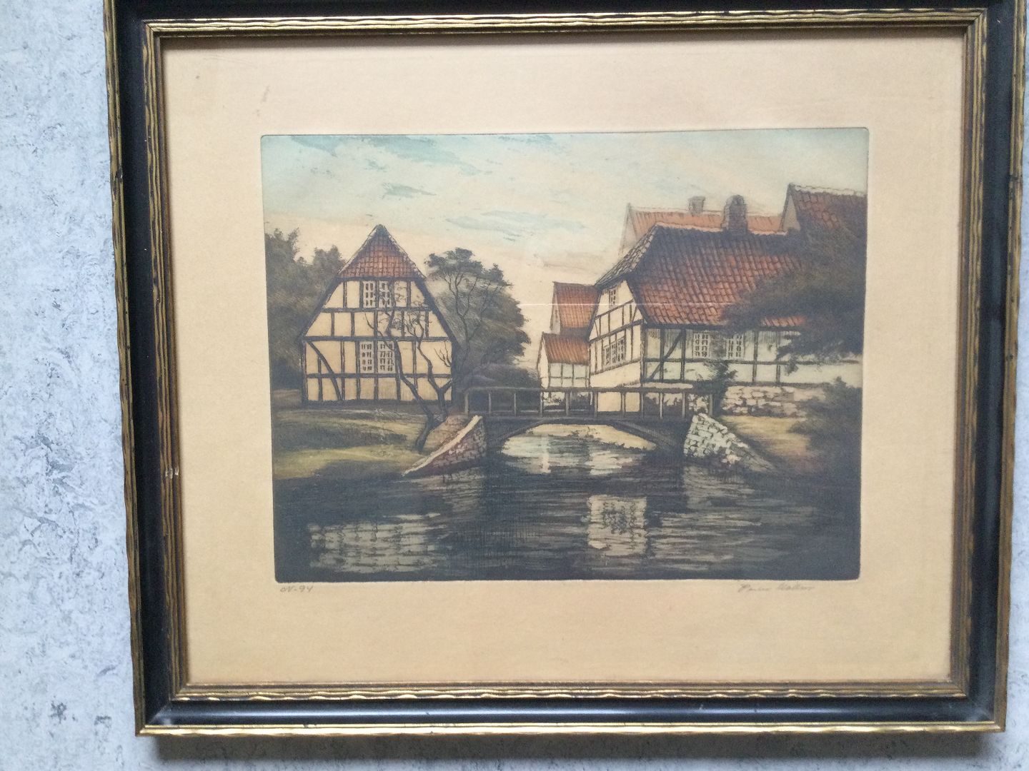 Farveradering af Peder Møller - Gamle huse ved vandløb.