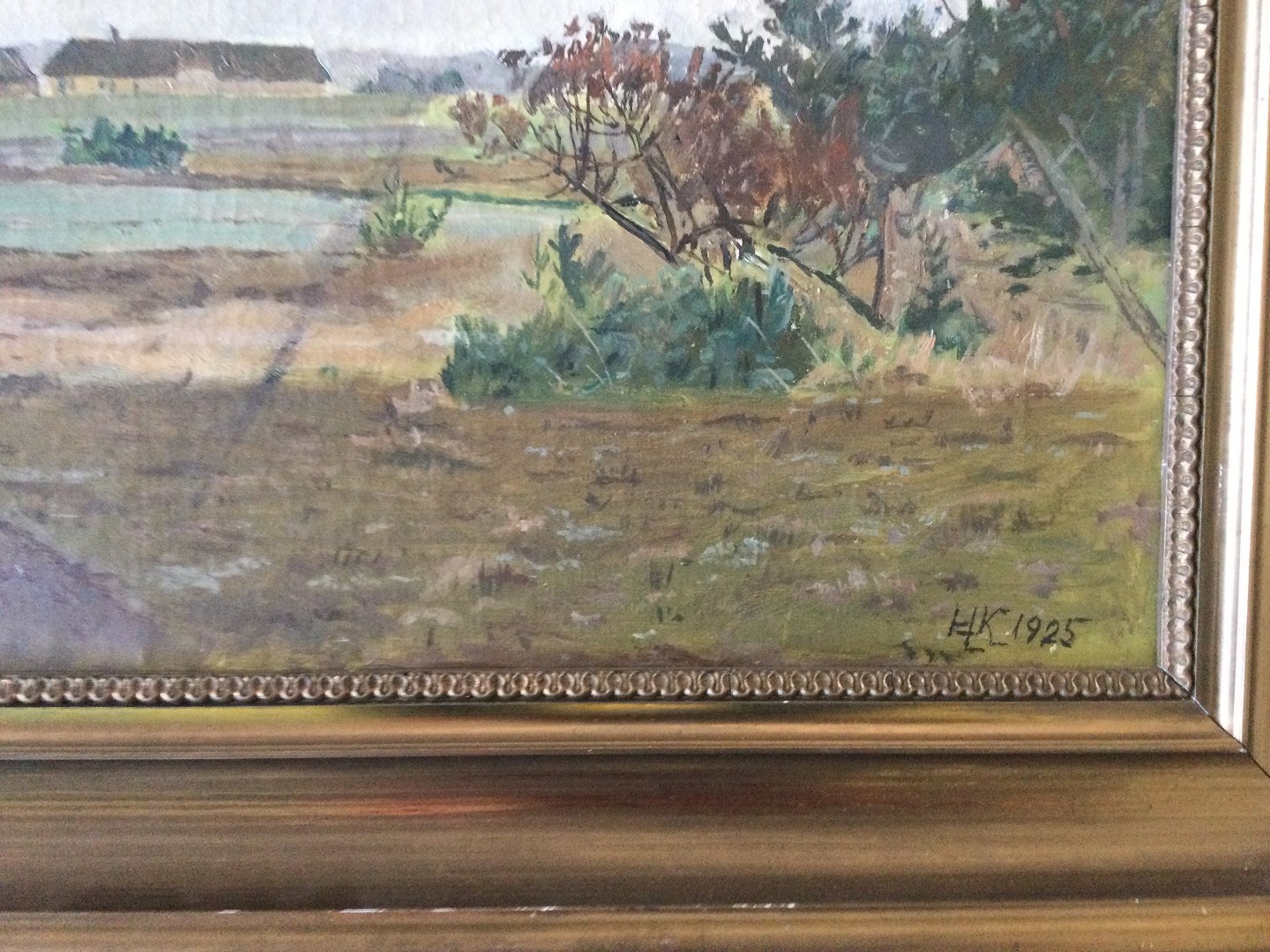 Maleri af Hans Knudsen 1925 - landskab med bondegård.