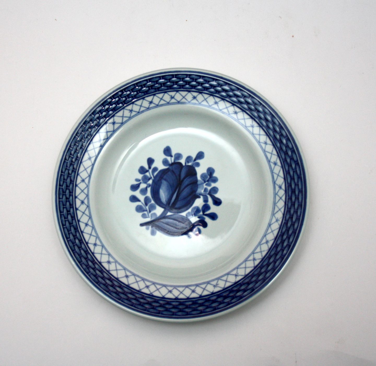 Royal Copenhagen, Tranquebar lyseblå fajance med mørkeblå tulipan og flettet bort designet af Christian Joachim. Produceret fra 1914 til 1969 på Aluminia derefter videreført hos Royal Copenhagen. Flot stand.