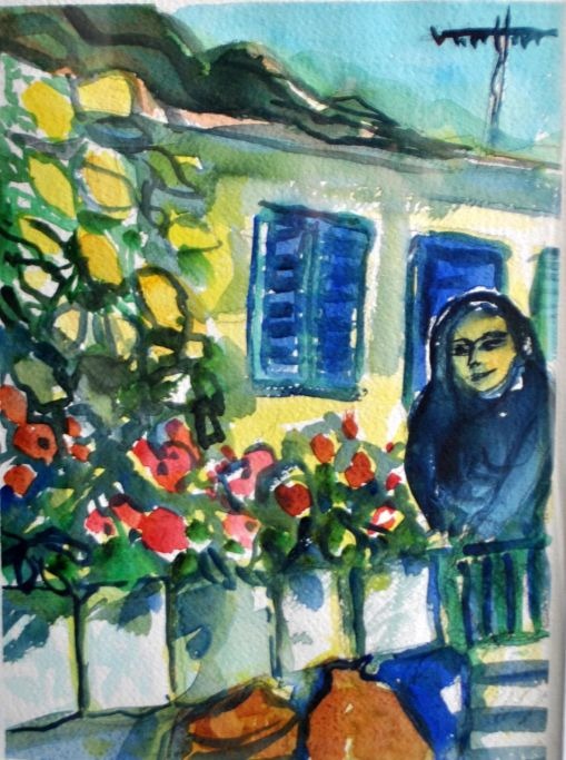 Degett, Karen (1954 - 2011) Danmark: En kvinde foran et hus, Kreta. Akvarel på papir. Signeret 2006. 38 x 28 cm.  Indrammet. Proveniens: Kunstnerens bo. Motiv fra Kreta, hvor kunstneren boede i en længere periode.