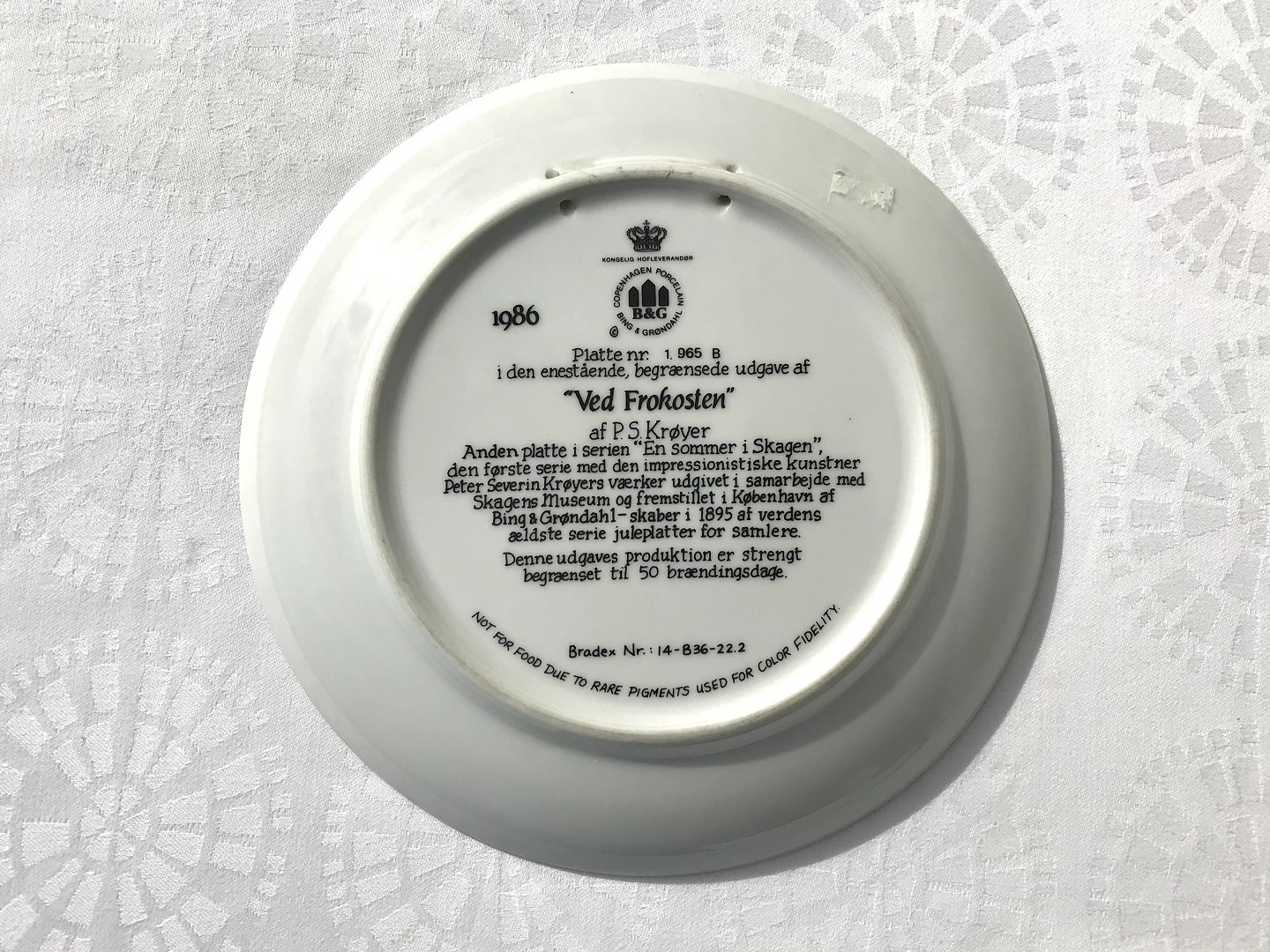 Bing & Grøndahl, Skagensmalerne, 1986, Platte nr. 1, “Ved frokosten”, P.S. Krøyer, 21cm i diameter *Perfekt stand*
