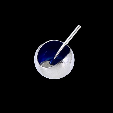 Georg Jensen. Sterling Silver Salt Cellar with blue Enamel and Spoon #1067 - SGJ