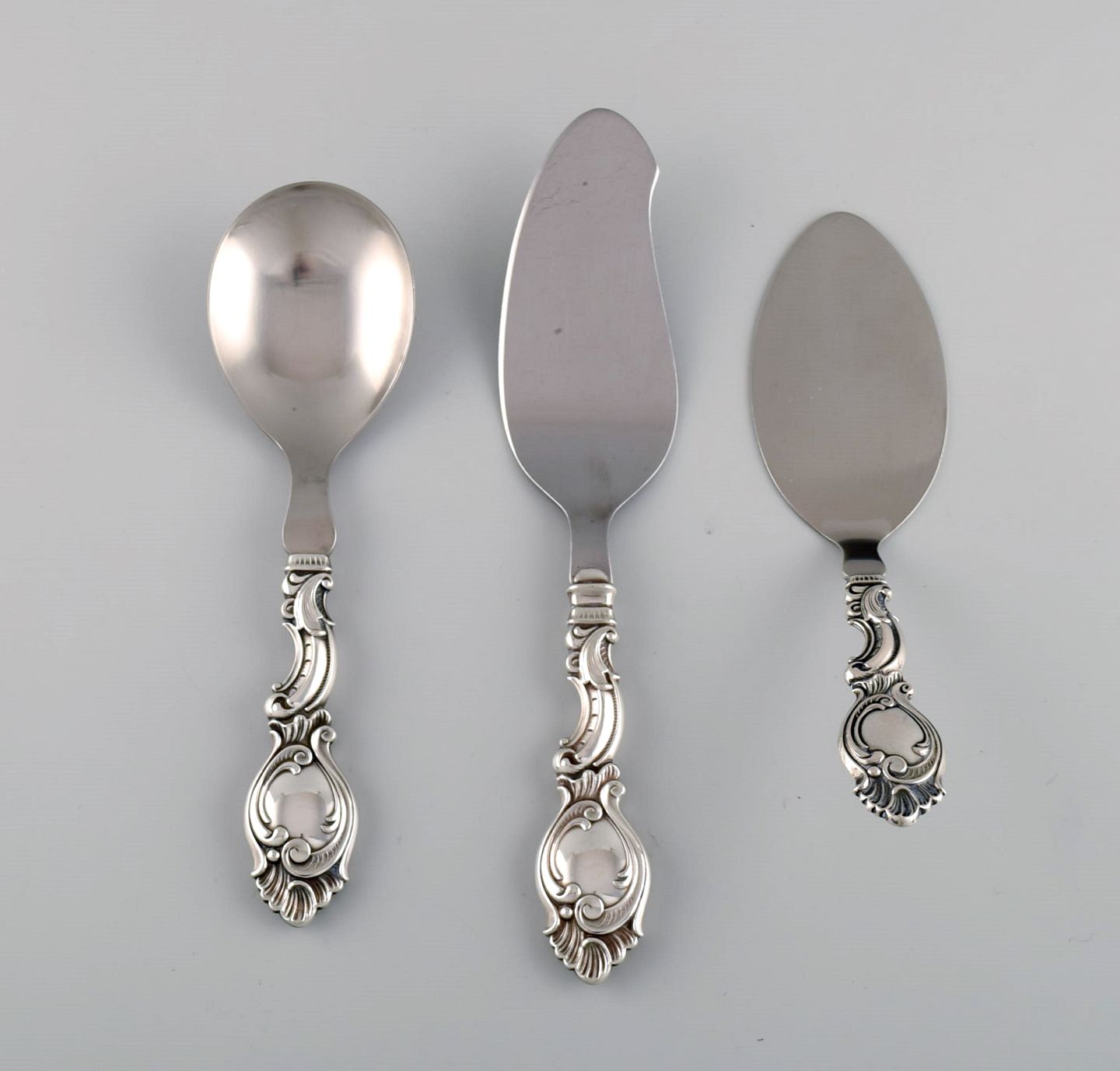 Dansk sølvsmed. Tre serveringsdele i tretårnet sølv. Rokoko stil, 1940'erne.
