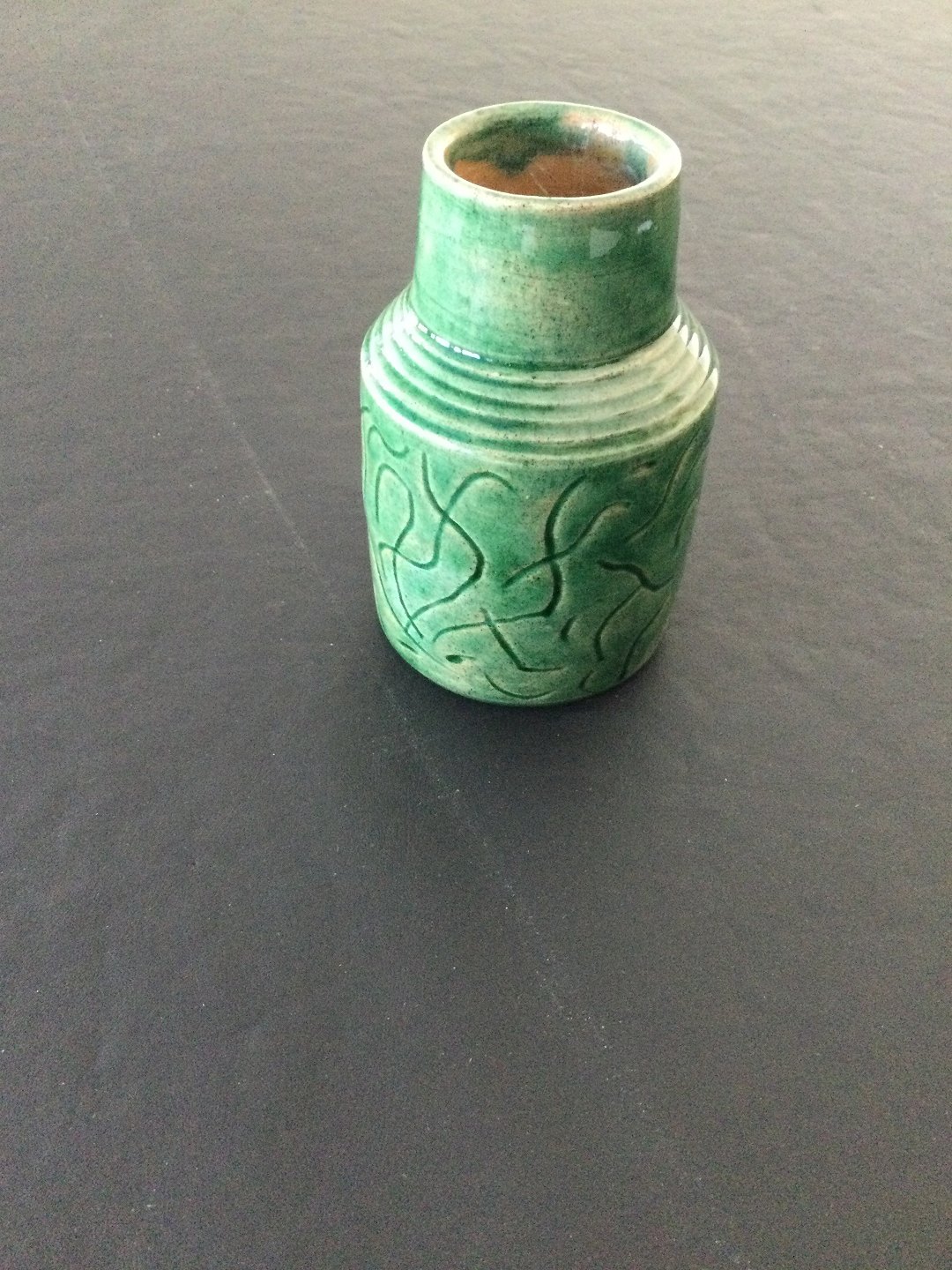 Vase med grøn glasur og streg dekoration.