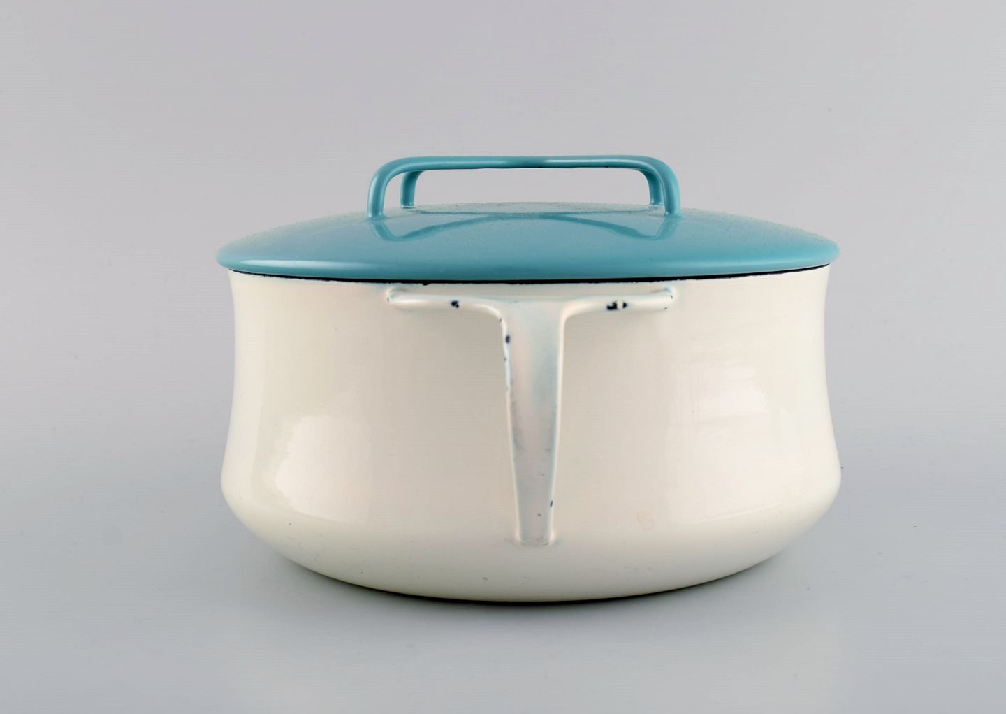 Jens H. Quistgaard: Gryde med låg i turkis og cremefarvet emalje.