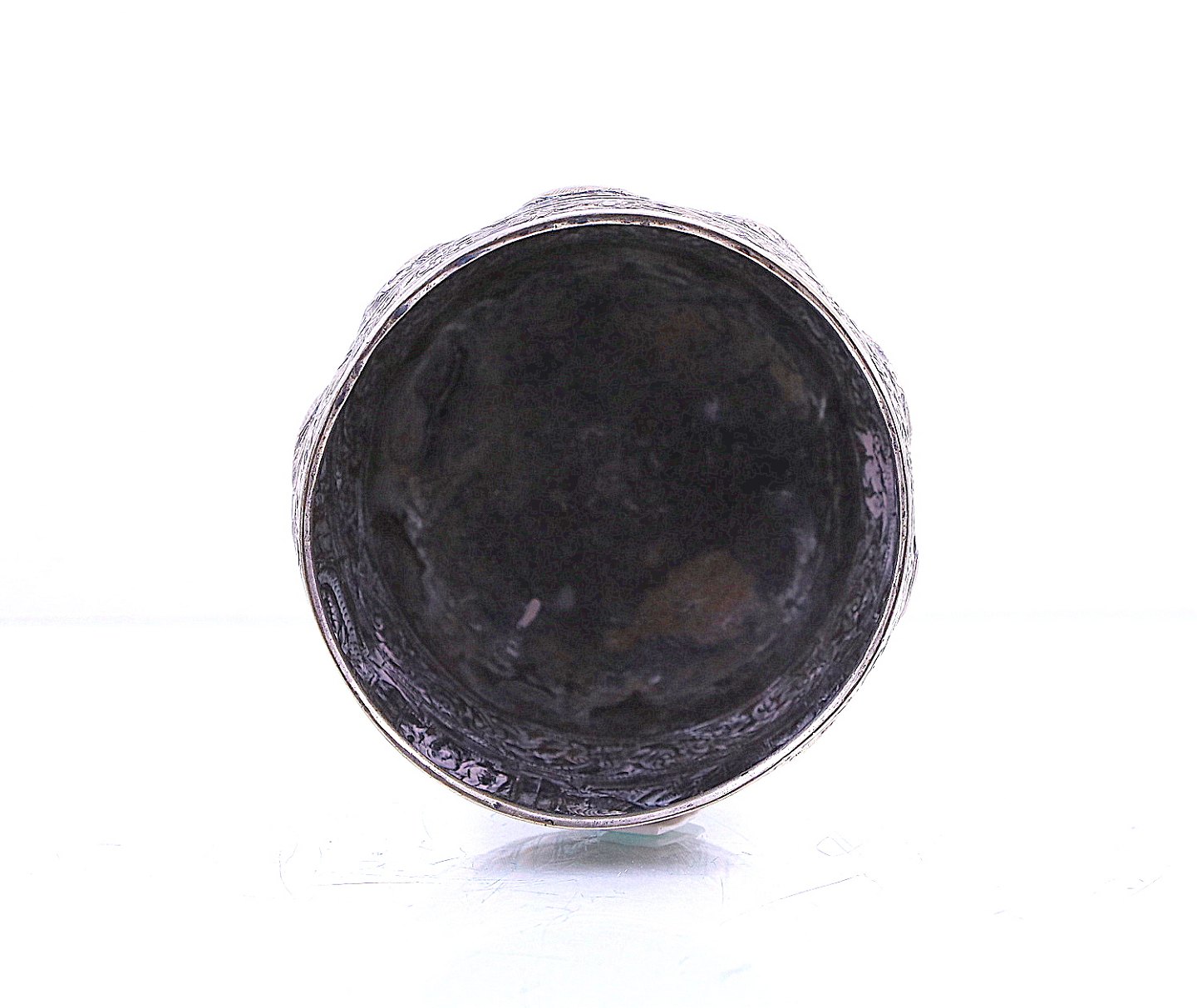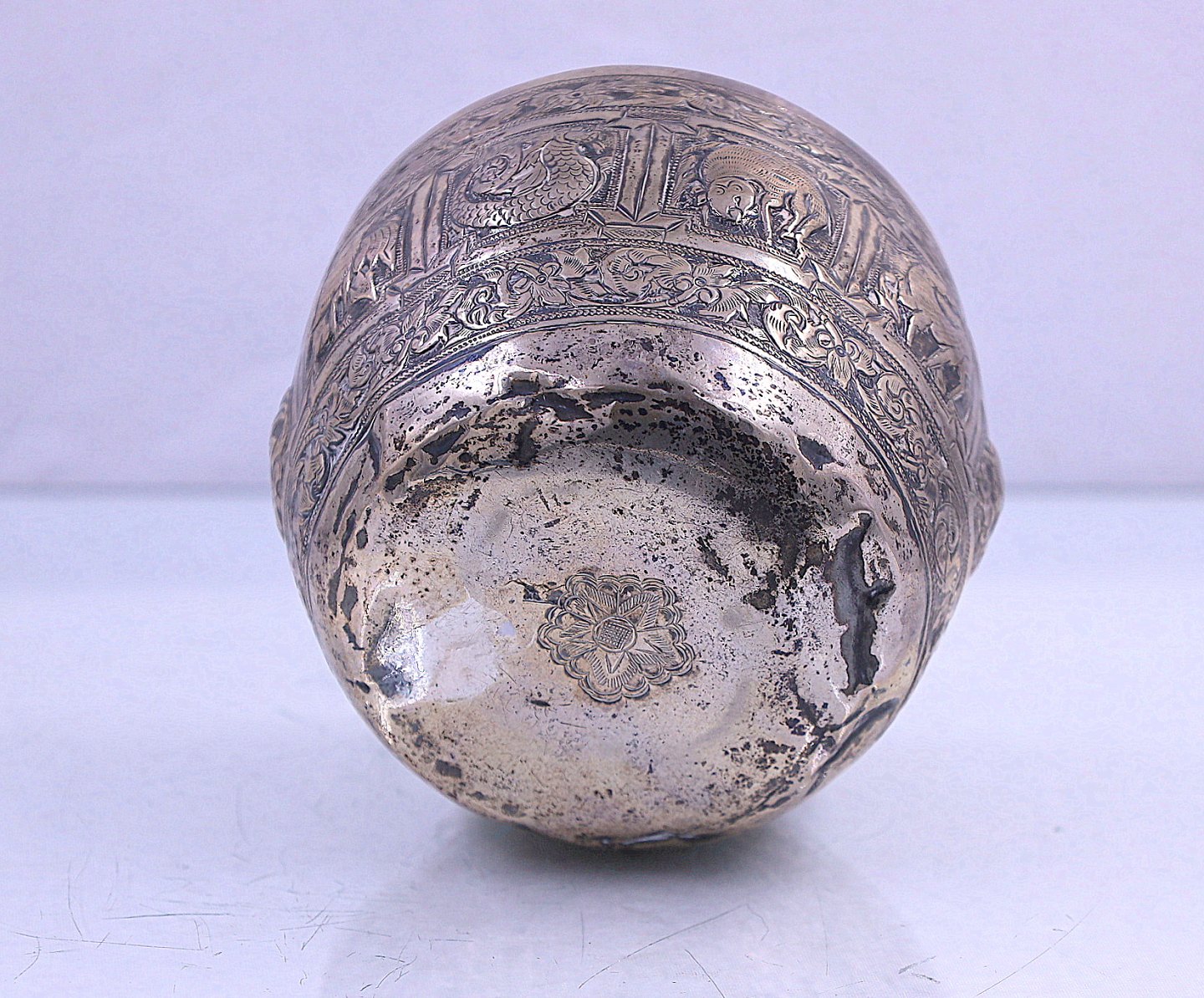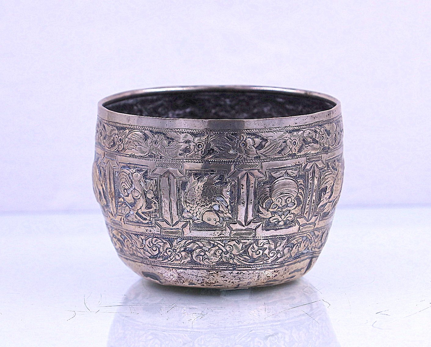 Sølvskål dekoreret med fantasidyr, hele vejen rundt. Kruset har en stjerne i bunden. Formentlig fra Indien