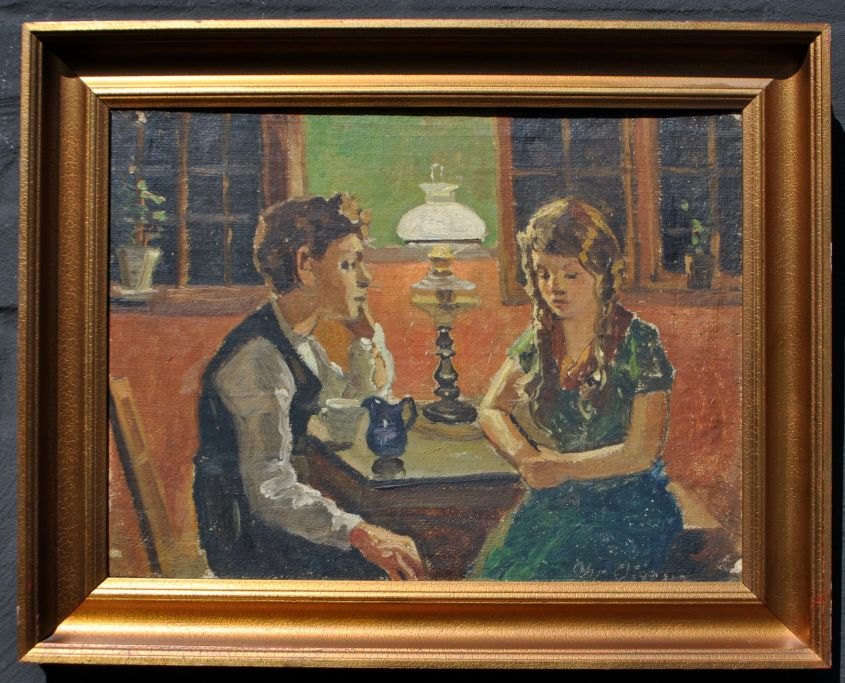 Aigens, Christian (1870 - 1940) Danmark: To børn ved et bord. Olie på lærred/opklæbet på plade. Signeret. 30,5 x 41 cm.