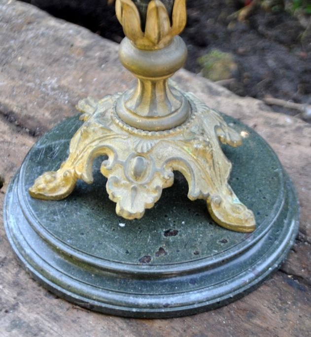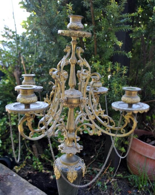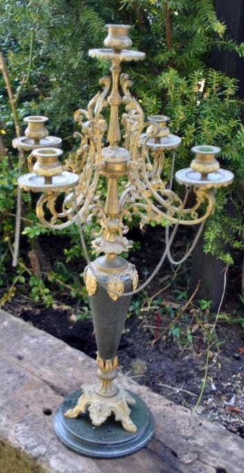 Fransk kandelaber, 19. årh. Poleret grå marmor med bronze. 5 lyseholderen. Dekoration i form af løvefødder og bladværk. Med hængende kæder. H.: 61 cm.