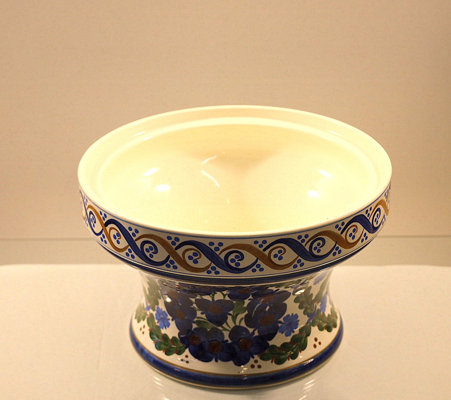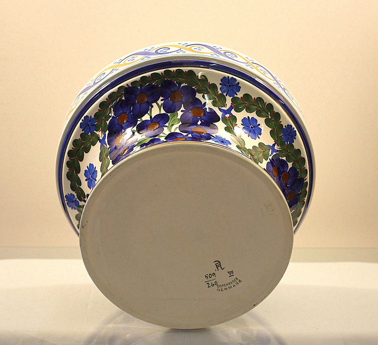 Aluminia. Jardiniere nr. 509/206. Jardiniere af fajance, dekoreret, i farver, med stiliseret blomster og ornamentik.