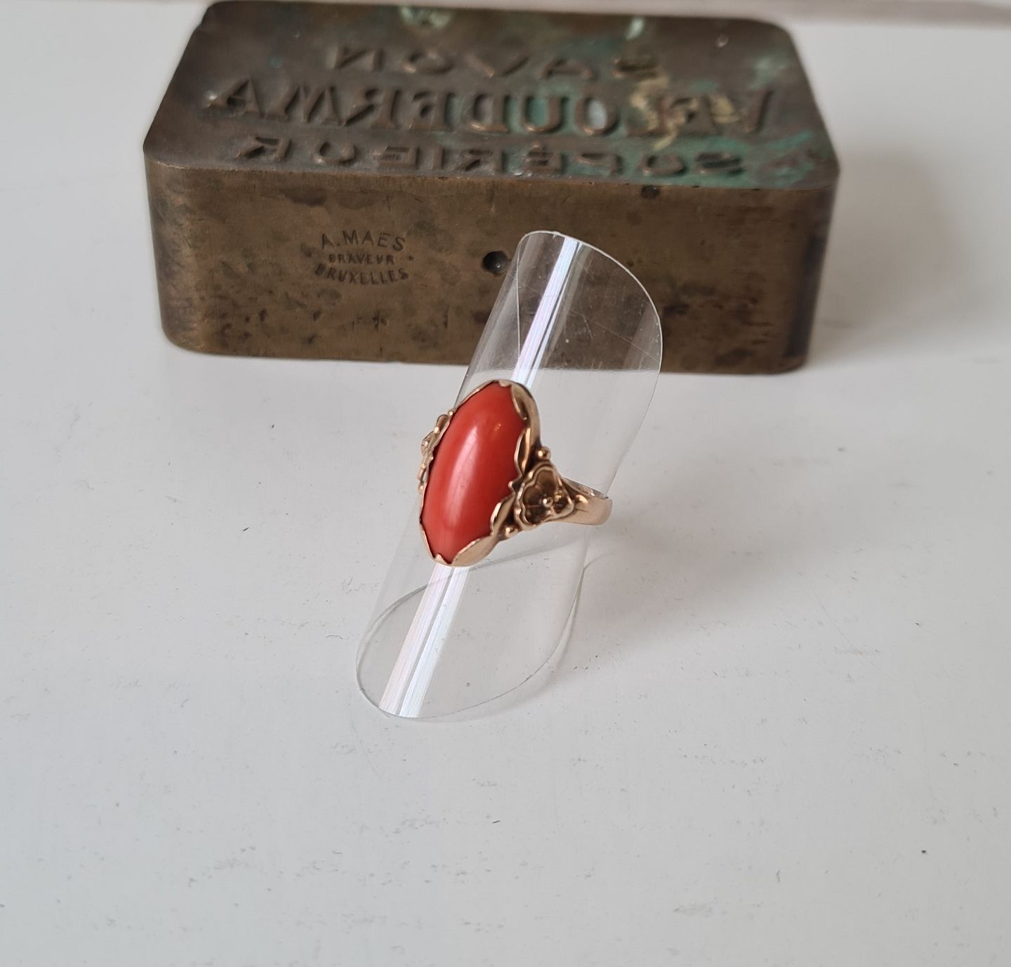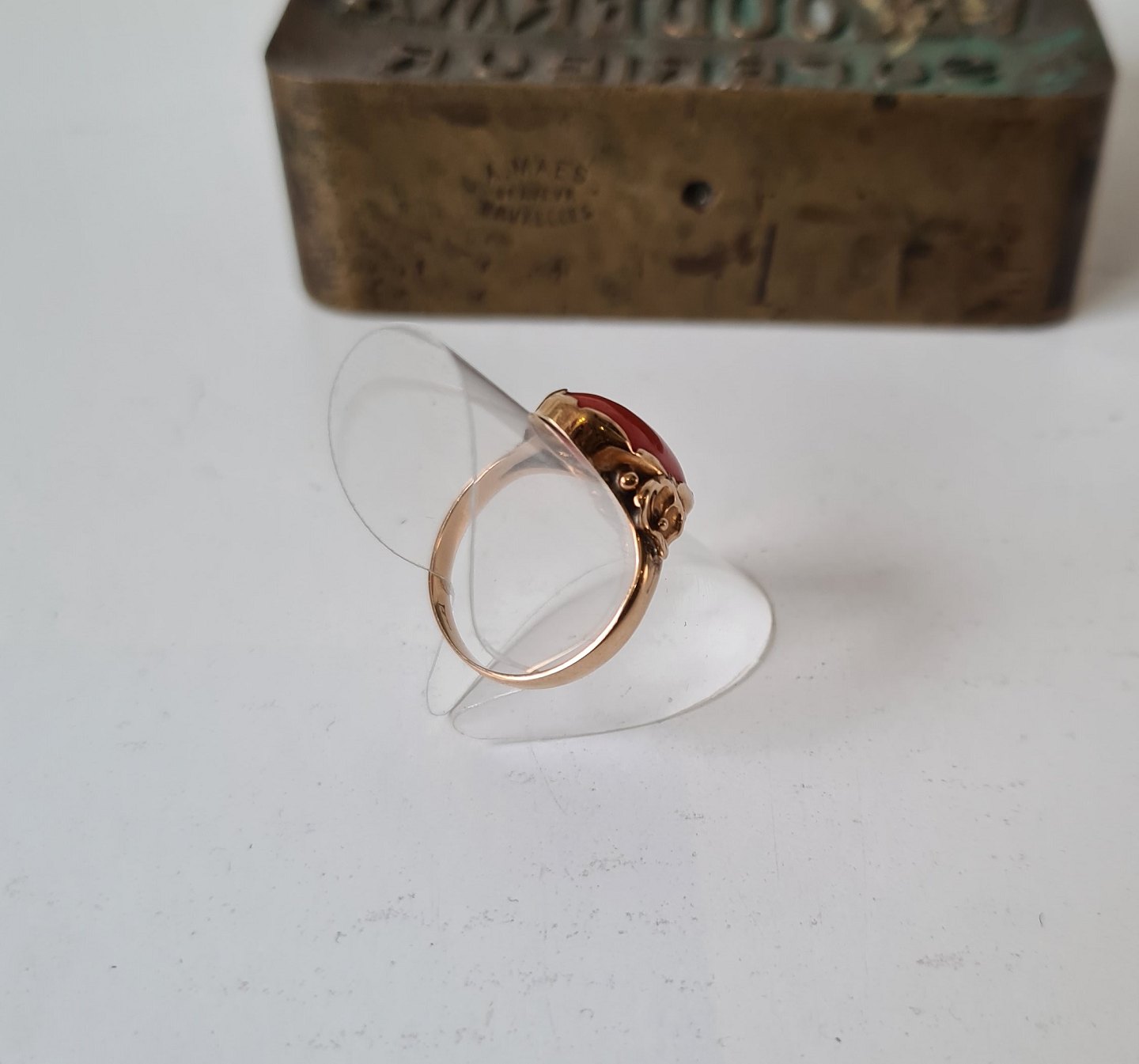 Beautiful wood ring in 14 kt gold with coral