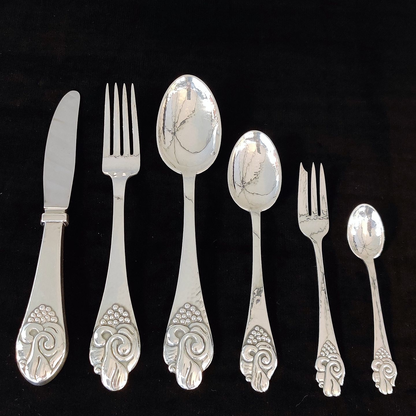 Bestik af tretårnet sølv til 10 personer. I alt 68 dele,