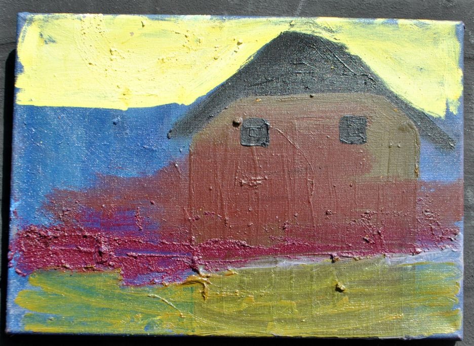 Kühl, Lena (1950 -) Danmark: Landskab med hus. Acryl på lærred. Verso signeret 2018. 27 x 38 cm.  Uindrammet.
