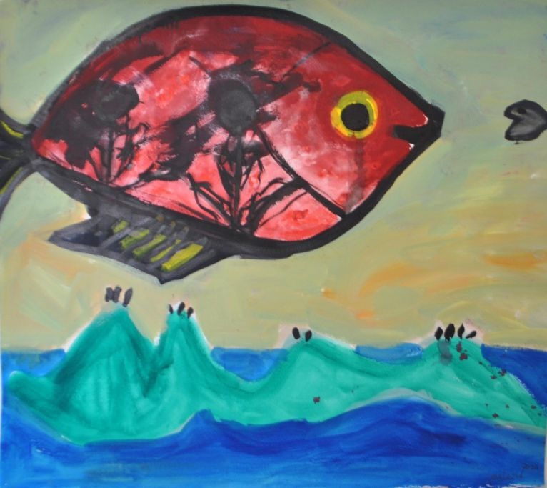 Kühl, Lena (1950 -) Denmark: Composition with fish. Ink / watercolor on paper. Signed 2020. 47 x 53 cm. Unframed.