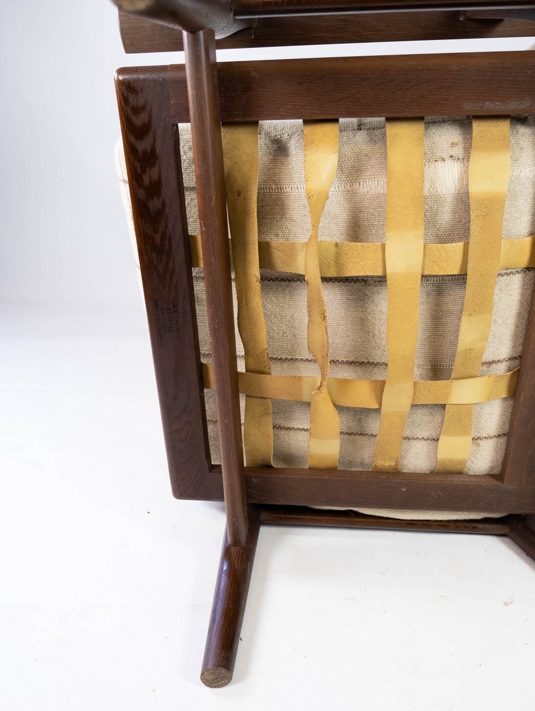 Den mørke eg giver stolen en varm og rustik atmosfære, mens det lyse stof tilføjer et strejf af lys og luftighed til designet. Den ergonomiske form og komfortable polstring gør stolen ideel til både afslapning og funktionel brug.