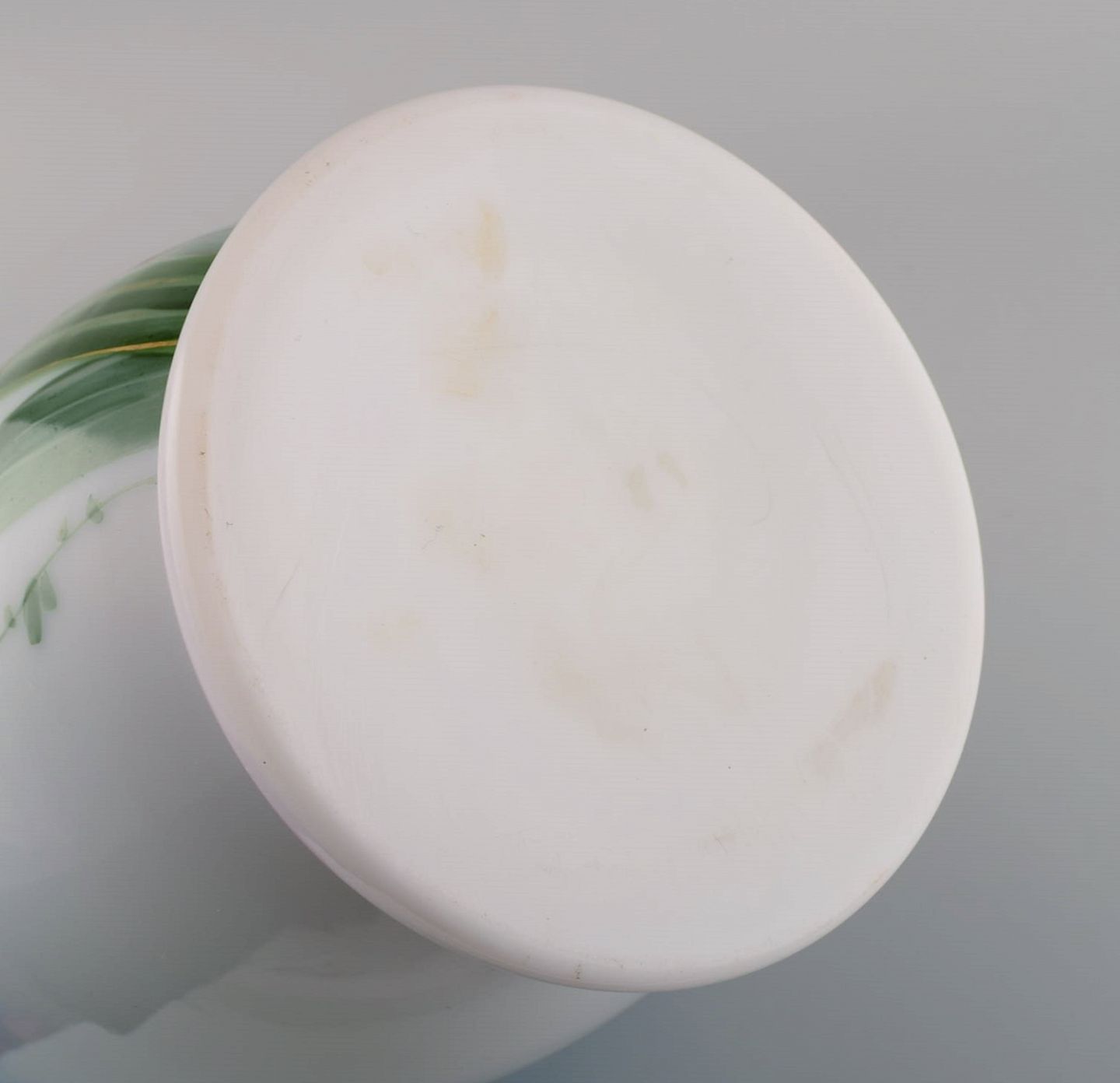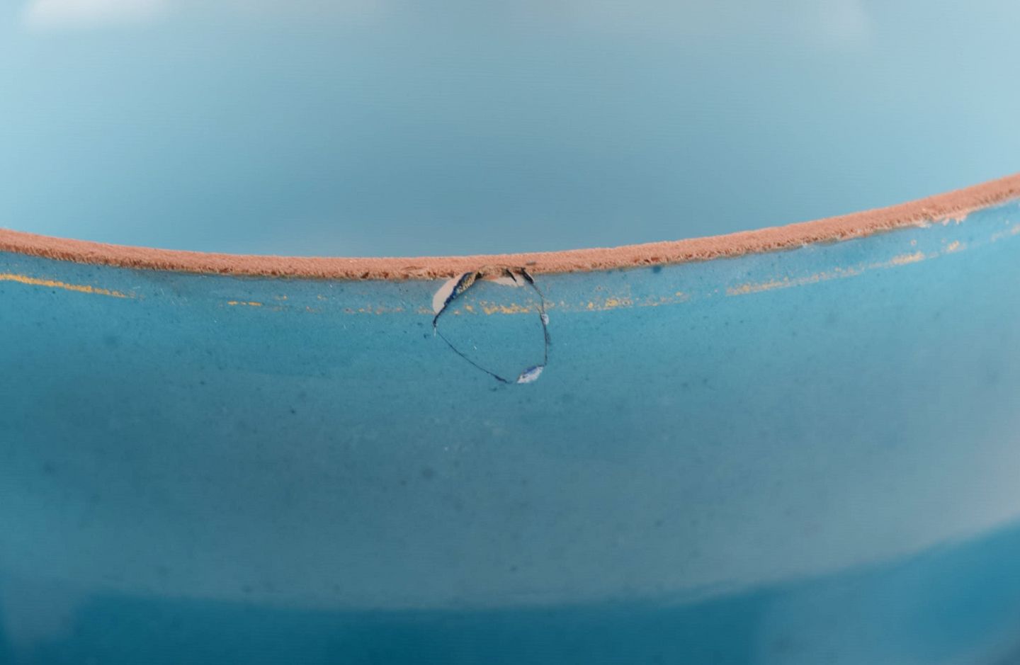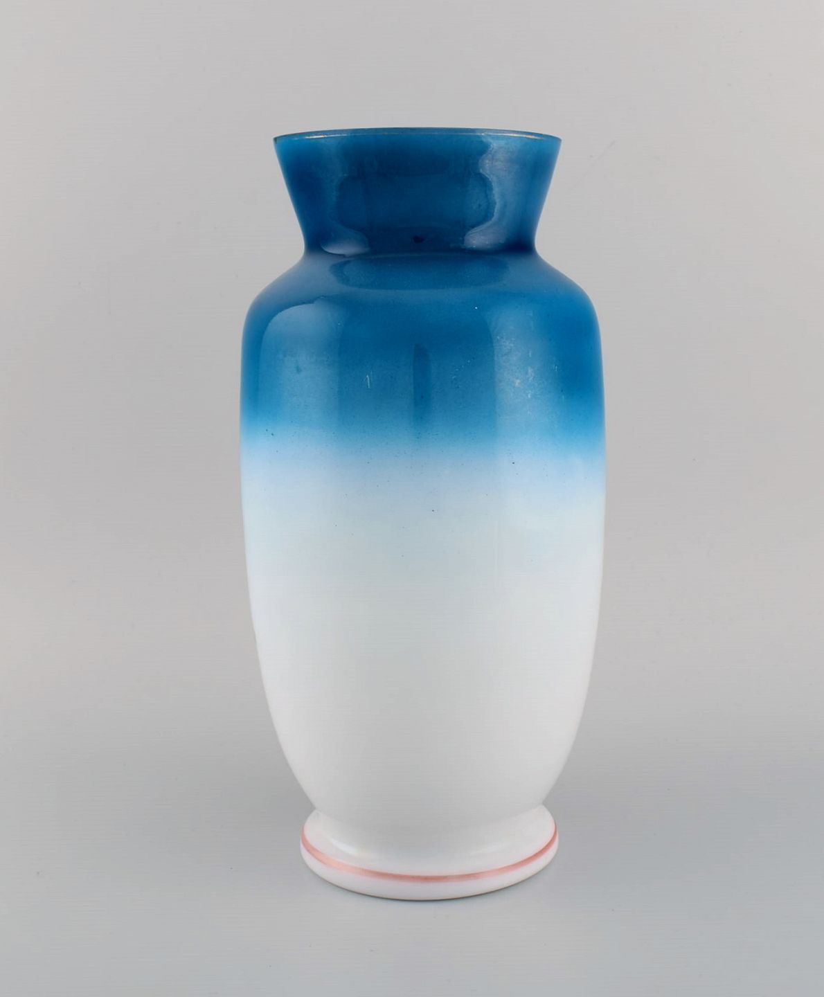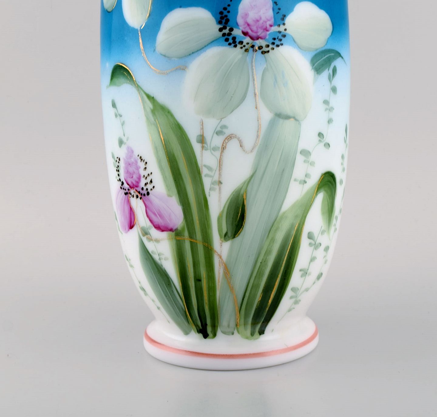 Antik vase i mundblæst opalineglas med håndmalede blomster og bladværk på blå baggrund. Ca. 1900.
